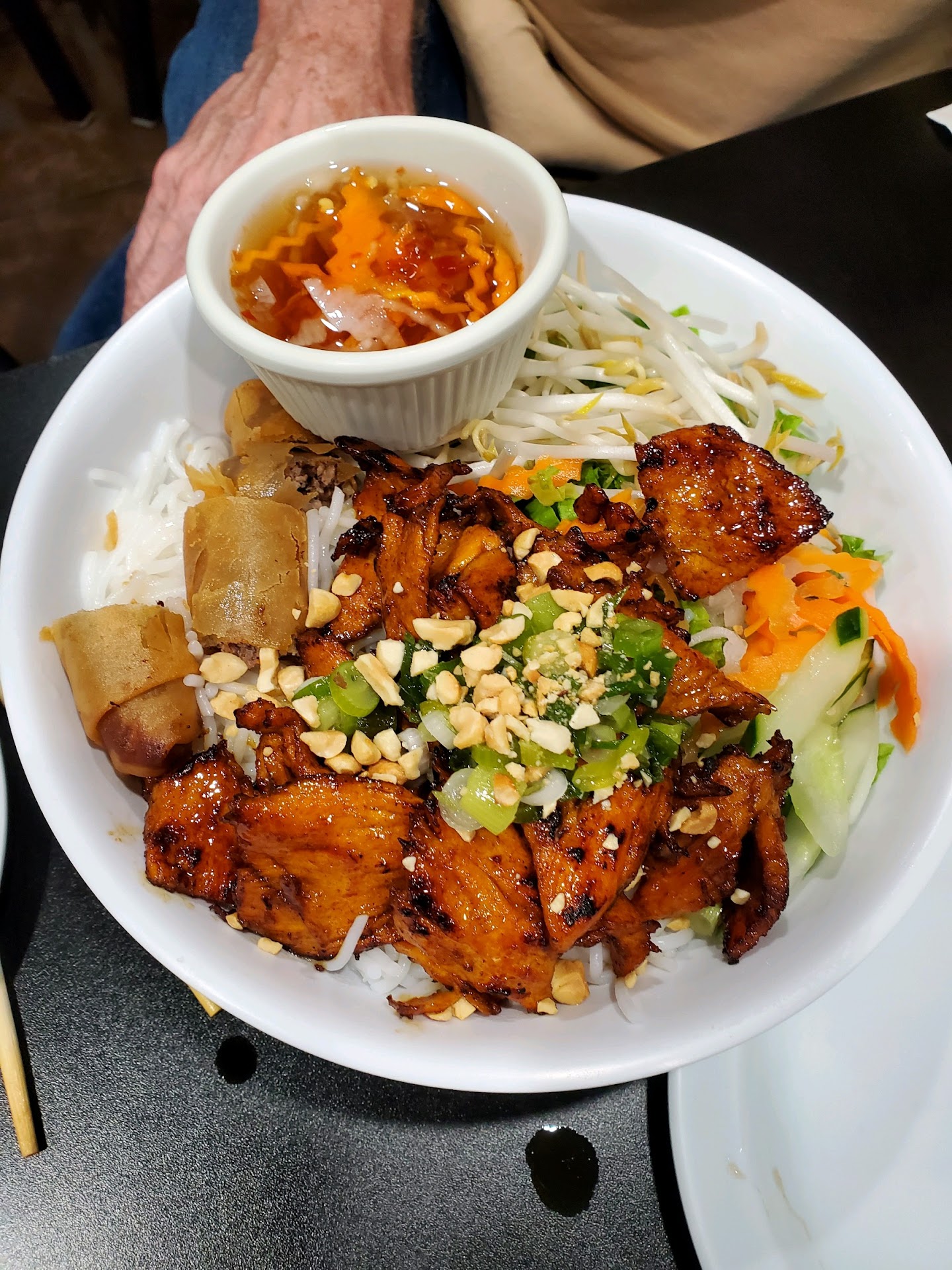 But, as I said, the food itself was not that interesting to my palate, nor to the others. The Lemongrass Chicken stir fry and the Bun Honey Chicken Bowls were pretty bland. Each table in the restaurant had big bottles of Sriracha and Hoisin Sauce available and we used them ā liberally. Looking around at the other diners, they were using them too. However, thatās not a good thing. Our third member ordered Chicken Pho. He claimed that it was a decent chicken soup, but again, it was just decent ā not outstanding.