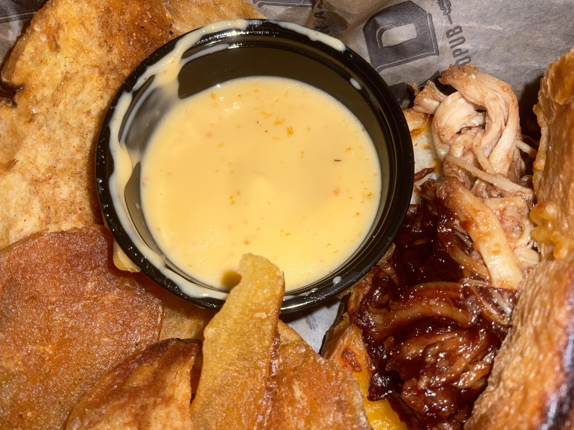 The actual sandwich itself was decent. Definitely not worth the money if you're craving good comfort food and just that, nothing more, but it wasn't bad. The chicken was sweet and pretty tasty. A little dry but not bad. Cheese was okay and the bread was nothing special at all. Pretty underwhelming. The dipping sauce, although the container was small, was actually quite tasty and cheesy. So, since the cheese they used in the sandwich was pretty flavorless, this helped.