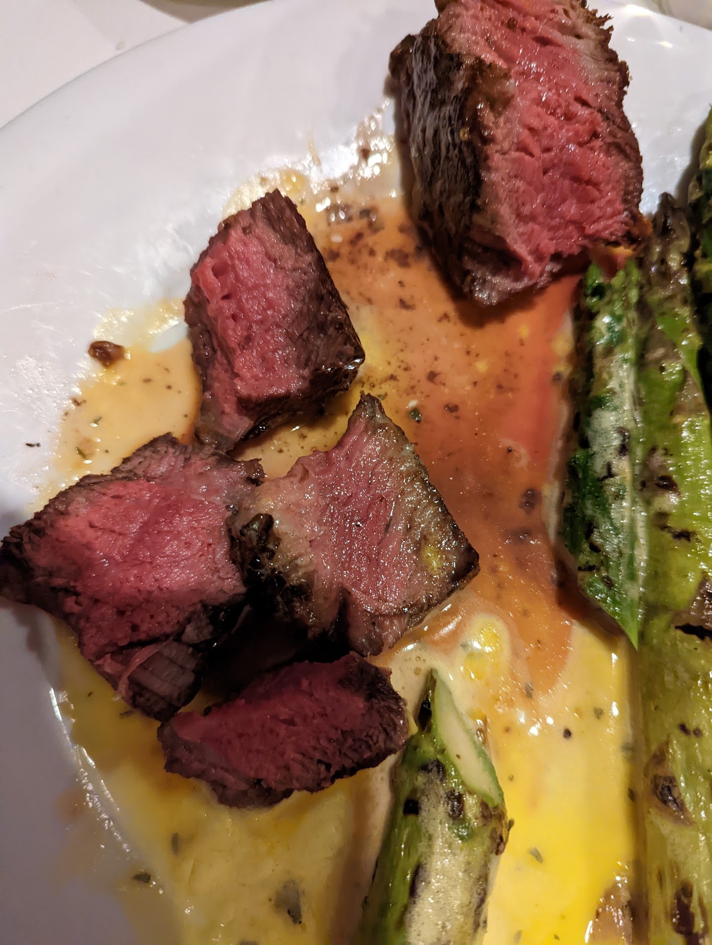 Im attaching a photo that will cause some people to salivate and rush to this establishment to order a filet. You can see one piece with sauce on it that is completely rare, and another at the top corner. There are others as well but they were flipped over. Overall this steak was just very shy of rare when the first was rare. If this was the first steak, I might have risked it and enjoyed it. But after waiting 15 minute for them to flash my steak a bit more, and then getting a much smaller steak that still wasnt done close to what I asked for - I was PO'd and didnt eat it. And yes that is the...
