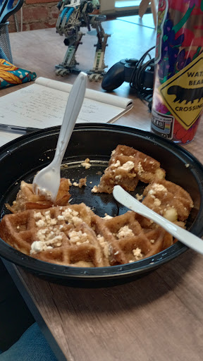This review is about the location in Southside. There's a tl;dr at the end. I did take-away so it was a limited atmosphere experience. Seemed like a normal kind of diner, just more brown and wooden? I was VERY excited when I learned they make gluten free waffles (I have Celiac disease). It's only for the "design your own" section, at least when ordering online. Not for the specials. You also can't specify decaf for any of the coffee drinks (I ordered the signature drink that was supposed to have hazelnut, vanilla, and maple flavor with foam on top). But I figured I could deal with full caf for a day, and if I happened to get there before they made it, I could always ask them to do decaf instead. The order was supposed to be ready to be picked up at 16 past the hour. I got there shortly after that and it wasn't ready. The place was basically empty. As far as I could hear and see there were two tables there, two servers, and two kitchen staff. They were all sort of meandering around slowly, and when one server finally came to greet me, they weren't pleasant at all. I've been a server multiple times in different places, so I know how hard it can be and always try to give the benefit of the doubt, so I was friendly to them and told them my name and what I was there for. They had me sign a receipt (we'd already tipped 15-20% online, our usual for take-away), then set it down and just walked away. Another server came out and started prepping a to-go hot drink and I asked if that was mine and if so, could they make it decaf please, since there wasn't a way to request that online? The server just said "it's not yours," and finished what they were doing. Apparently didn't tell the other server. I waited another 10 minutes before the other server brought out the bag and said "here you go!" (the friendliest anybody had been). I said I still had a drink. The signature. Then I remembered we'd ordered it separately, trying to do it decaf, so I apologized and explained it was a separate check. They sighed and started prepping it and I quickly asked about the decaf, explaining the order issue. They didn't respond, but I could tell they were unhappy about it. I felt badly, but I had been very friendly, and when I was a server I was happy just to have someone be friendly and kind to me. Nobody ever tipped me on take-away orders. I only had 45min to have lunch with my spouse IF the food had been ready on time, which it wasn't, and now because of the very long wait I was going to have about 10min with him. I just wanted to get out of there, so I wasn't paying much attention while the server made my drink. I thanked her when I got it, and rushed out. It wasn't until I tasted it a few minutes later when I was at my spouse's office that I realized it was plain coffee/espresso. I don't even know if it was decaf. But it tasted terrible and had none of the things from the signature drink in it I'd paid for. I wasn't going to go back, obviously, because we had no time at that point, and it looked like it was just those employees on the floor. So my spouse drank it instead because he can drink motor oil if it smells like coffee. Tl;Dr It was super depressing atmosphere inside, servers were rude, food wasn't ready in time, so it ruined rare lunch date with spouse, and I was given plain coffee instead of signature drink I paid for. Lame. 2/5 stars. Only gets even the 2 stars because of the gf waffles, which I haven't been able to have since developing Celiac disease after a major surgery....