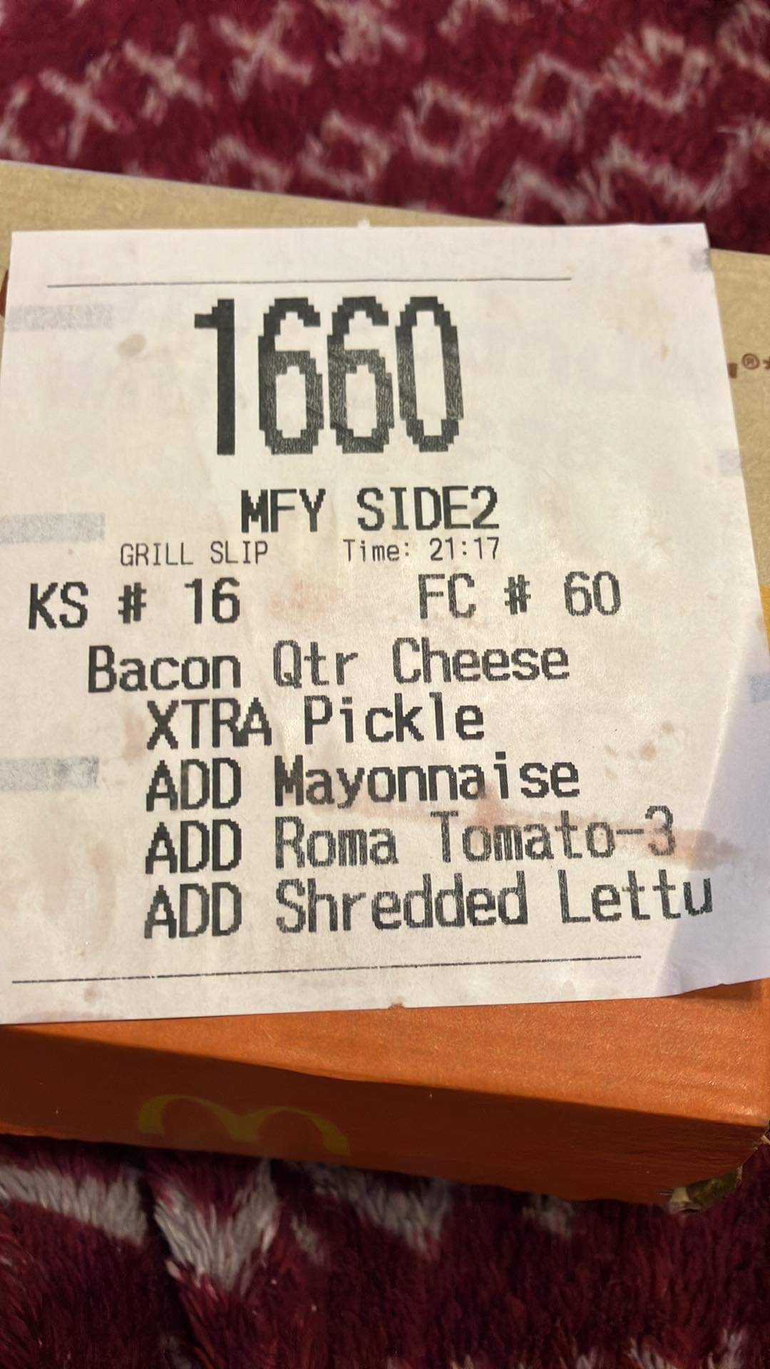 For the most part, the food was fine with the exception of a McFlurry mishap We ordered a Big Mac with nothing on it except for the sauce & onions, 2 medium fries, a medium drink and an Oreo McFlurry.