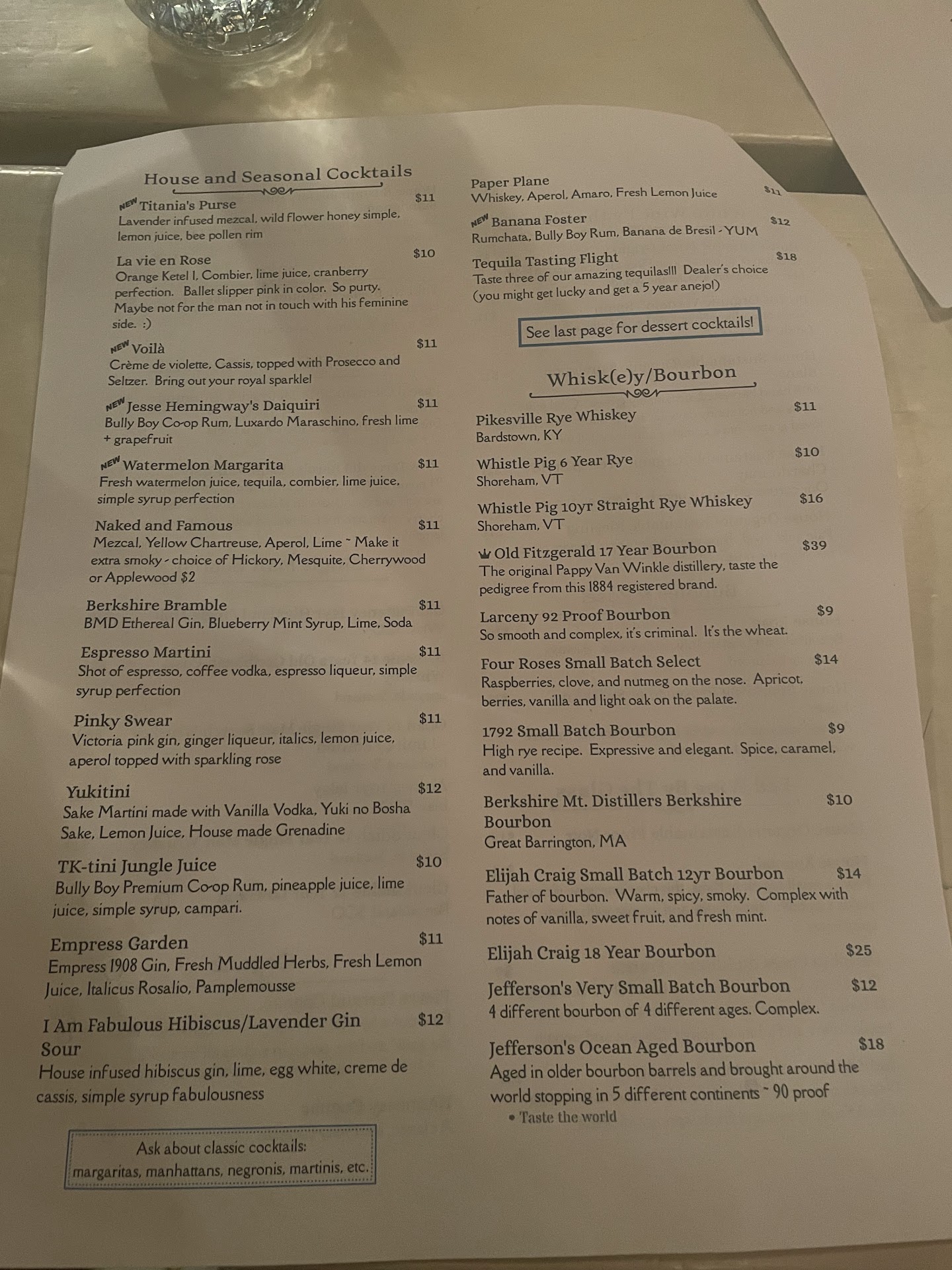 We started with a well-made round of cocktails, and a few of us had wine. Their cocktail and wine list is deep and well done!