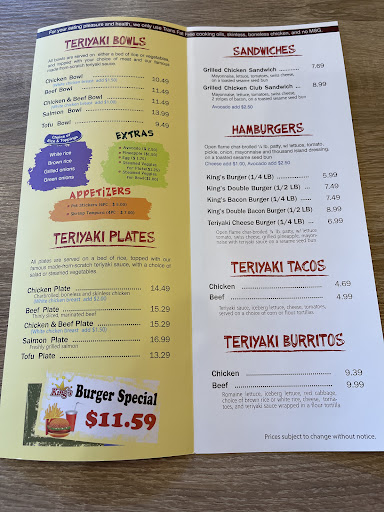 Read moreFirst visit, went for dinner with a friend and we loved it. Super friendly and helpful staff, very clean and neat surroundings, quick service and the food was terrific! We both had the combo plate of chicken and beef, with rice and then half vegetables/half salad (with Honey Mustard dressing). The teriyaki sauce was not like I've had elsewhere...it appeared more "gravy-like" but we both liked it. I had some salmon also and all three meats were terrific. In fact, in my opinion, that is what makes King's stand out far beyond it's other "teriyaki bowl" competitors. Their meat is premium stuff...or it appeared and tasted to me as though. These other places seem to use lesser cuts and quality meat...not here! HIGHLY RECOMMENDED that you try this place for very good, reasonably priced teriyaki bowl, burrito...