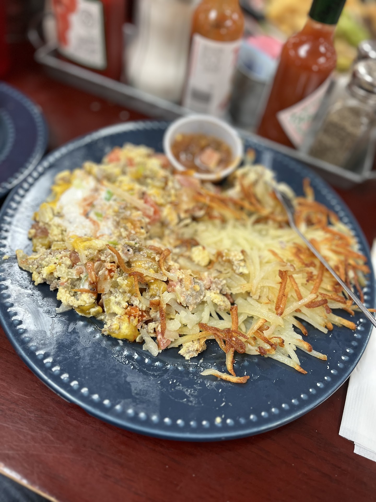 Most importantlyā¦.The FOOD was delicious! I ordered the Tijuana scramble with hash browns and a side of homemade biscuits. My husband got the mushroom burger with fries. I canāt speak for his burger(though he did rave about it) but I was very satisfied with my choice. Everything tasted fresh and the eggs were moist and not overcooked. Loved the veggies mixed in and the roasted corn salsa gave that extra bit of flavor (without the heat). The biscuits rivaled my momās biscuits and with a little butter they were perfection!