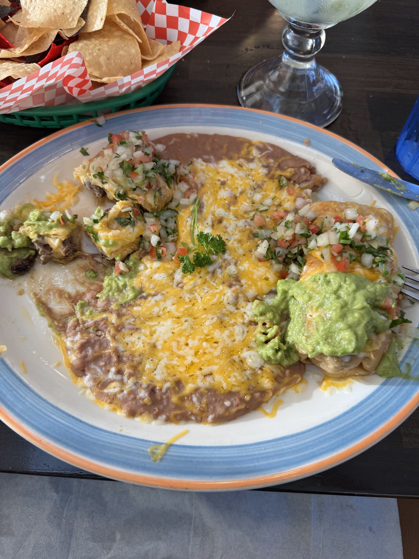 Very blan mexican entrees. Seems a favorite place for older folks. I've been here several times and I find a good variety of options, but everything I've ever ordered is very bland tasting. My MIL loves the salsa, but it just has no kick to it. I find it just tastes like tomatoes. However the texture is nice, just not enough spice. Chips are good. Prices have dramatically increased since our last visit. Expect $20 a person plus tip. My orders today included: The whole enchilada plate. 3 items/$17 and change. I chose the cheese enchilada, chili relleno & a hard beef taco. I opted for fruit as a side because I do not care for their bland rice/beans. My partner ordered the chicken fajitas. They sizzling plate was piled high with bell peppers/onions and tomato. Had to seach & theres not much chicken. I remember ordering fajitas here in the past and the plate would feed two of us. The flavor was spot on & came with all the fixings you might need to customize your tacos. The meal was ended with crisp cinnamon/sugar tortilla chips. This was a nice surprise, that I didn't remember being served in the past. Our server was tenitive. My inlaws said shes been there 20 years! Overall, I felt the atmosphere was nice. Nice murals painted & Hispanic decorations abound. Unfortunately, I didnt think to ...