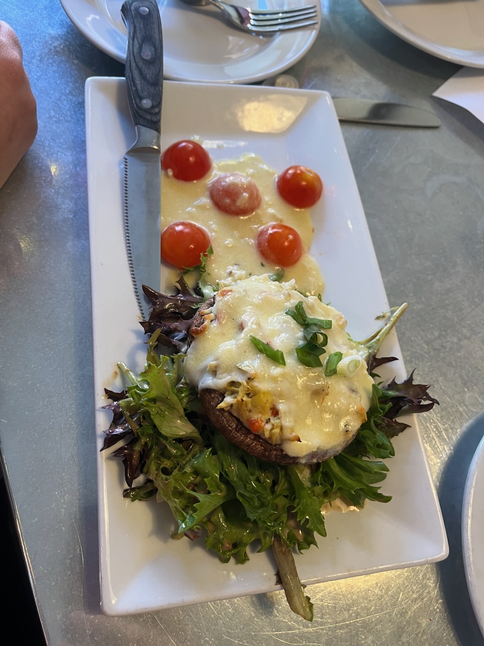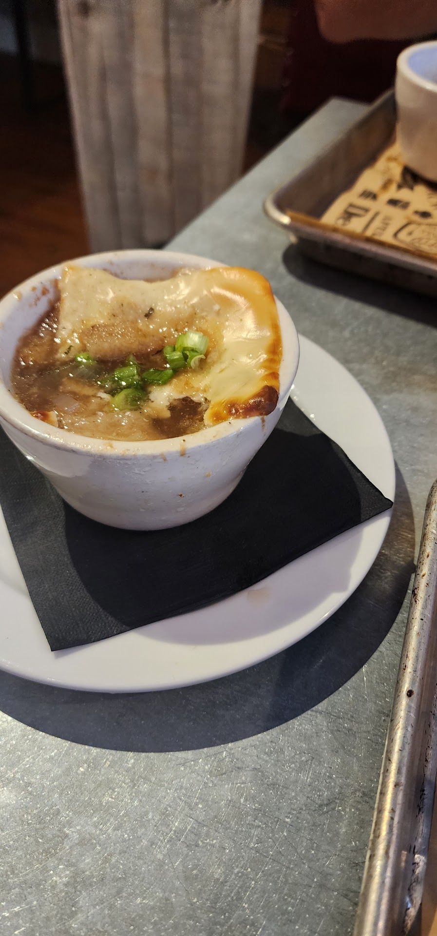 After peeling the tomatoes off the burger was pretty good. The French onion soup was highly disappointing when I saw the Kraft single style slice of cheese on top. Absolutely unacceptable for a restaurant with sit down dining to offer French onion soup with processed cheese that doesn't melt well on top. What was so unfortunate was the soup broth was delicious. Although the bread inside had gone completely mush the broth was on point. They have a good start with a good dish there if they can afford to get better cheese and make sure the bread doesn't turn to mush before serving.