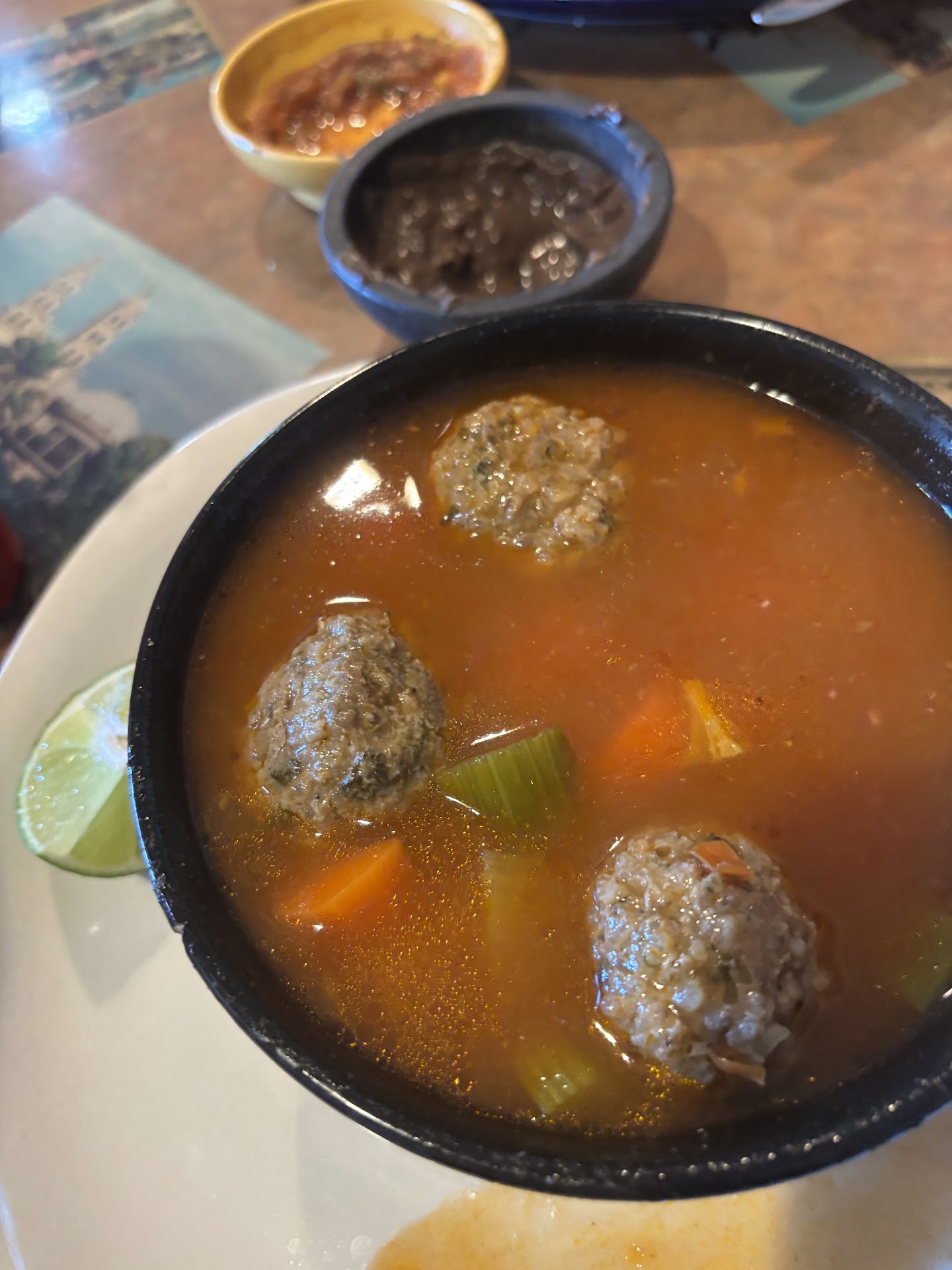 Simple, understated restaurant giving off 1980s vibes. They can accommodate largish party of diners, but it is recommended to call ahead to verify. The staff is welcoming. The restaurant has a separate bar and dining area. The food is hearty and filling. Safe seasoning and flavors..For dine in, they provide complimentary chips, red salsa, and hot bean dip. They have signature dishes of molcajetes. Impressive sight to behold of a huge molcajete (mortar bowl) filled with chicken, steak, shrimp, and veggies served in hot melted queso or hot creamy Chipotle sauce. Huge serving size. Being lactose intolerant, I have never tried it. But the sight of it always makes me pause and gawk and wonder what it tastes like. My go to's are the shredded beef and chicken crispy tacos. Simple traditional flavors. They have lunch specials offered during the week that run about $12.50. Non lunch specials- one entree combination plates run around $12.50, two entree $16.50, and...