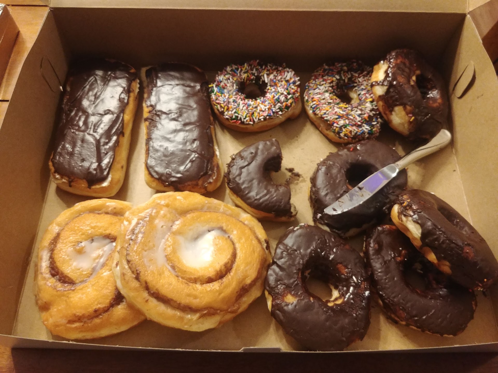 Upon viewing the selection of donuts, my first thought was that they didn't look like the usual offerings. The glaze on the cinnamon rolls was starting to crack as if dried out. The fritters, which is what I went there for, were not as "knobby" looking as usual and resembled dry lumps of dough. However, I ordered a blueberry--lemon and an apple. When I went to eat my apple fritter, I saw only half was glazed. Two bites in, I found it dry, hard, and flavorless.