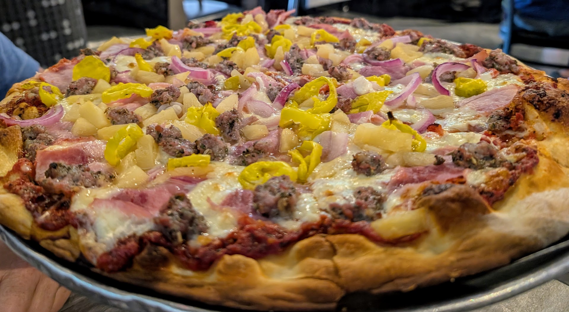 We had ham, sausage, red onion, banana peppers, and pineapple. Some places end up with a soggy pizza with pineapple, but this was okay. It was still a little soggy, but only in the middle toward the end of eating it.