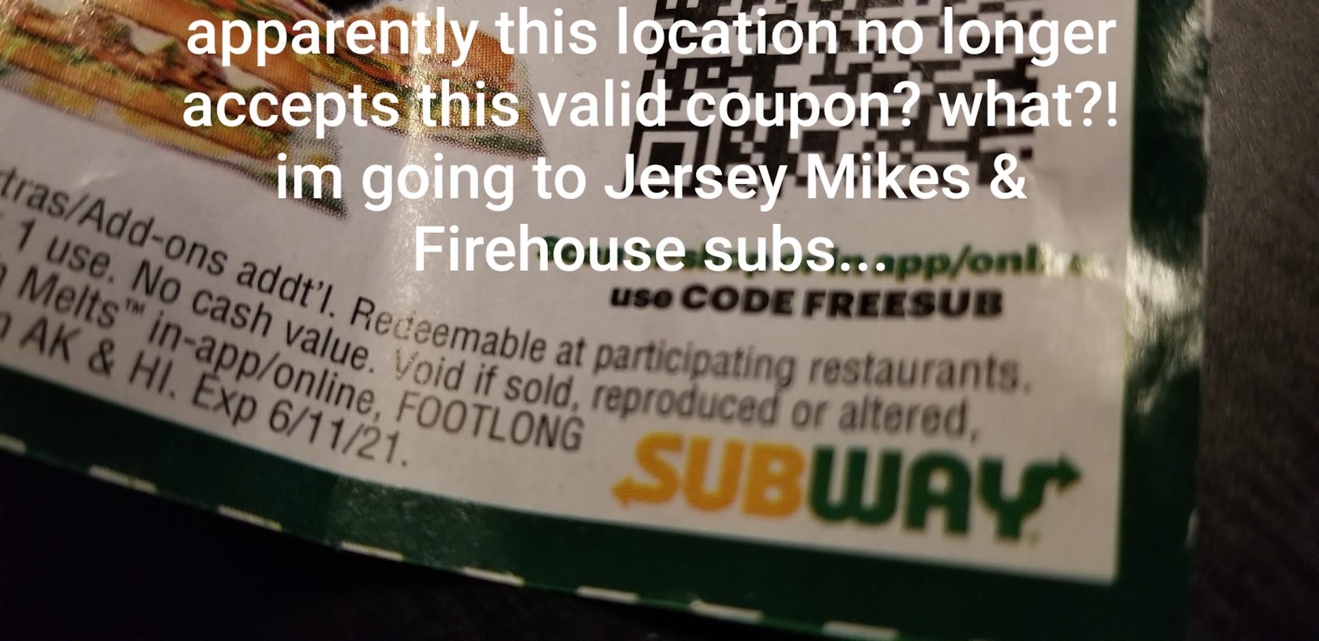 I feel bad for them because the owner clearly doesn't understand how business operates. There's a paper sign on the door that feels straight off a Twitter rant that explicitly states "due to increases in costs of labor, we don't accept Subway coupons anymore" which is absurd when locations all around this one do accept them. And it's never the cost of labor that's the problem, for anyone unfamiliar with economics, paying your workers is pennies compared to other costs, but blaming it on your workers is petty.