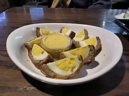 I came here because I heard they have good burgers. I ordered the Western Burger ($14). This has Cheddar cheese, thick-cut honey-cured bacon, beer battered onion rings, sweet bbq sauce. The burger was good. The meat was tender, however it was far from wow. While the meat was tender it wasn't standout in taste. So definitely above average, just not great. I upgraded the side to a side salad ($2). This time it was very ehh. Not much crunch and just boring, even for a salad. I also ordered the Scotch Eggs ($8.5). These are Hard-boiled eggs wrapped in pork sausage, coated in breadcrumbs, and fried, served with honey mustard. These were interesting, but also kinda blah. They need something added to them with a little heat. The person I was with ordered the Black and Bleu Burger ($14). This consisted of a Blackened patty, gorgonzola crumbles, thick-cut honey-cured bacon, mayo. The Burger was declared to be okay, but bland. This was surprising for a black & blue burger. It was cooked to a perfect medium rare though.