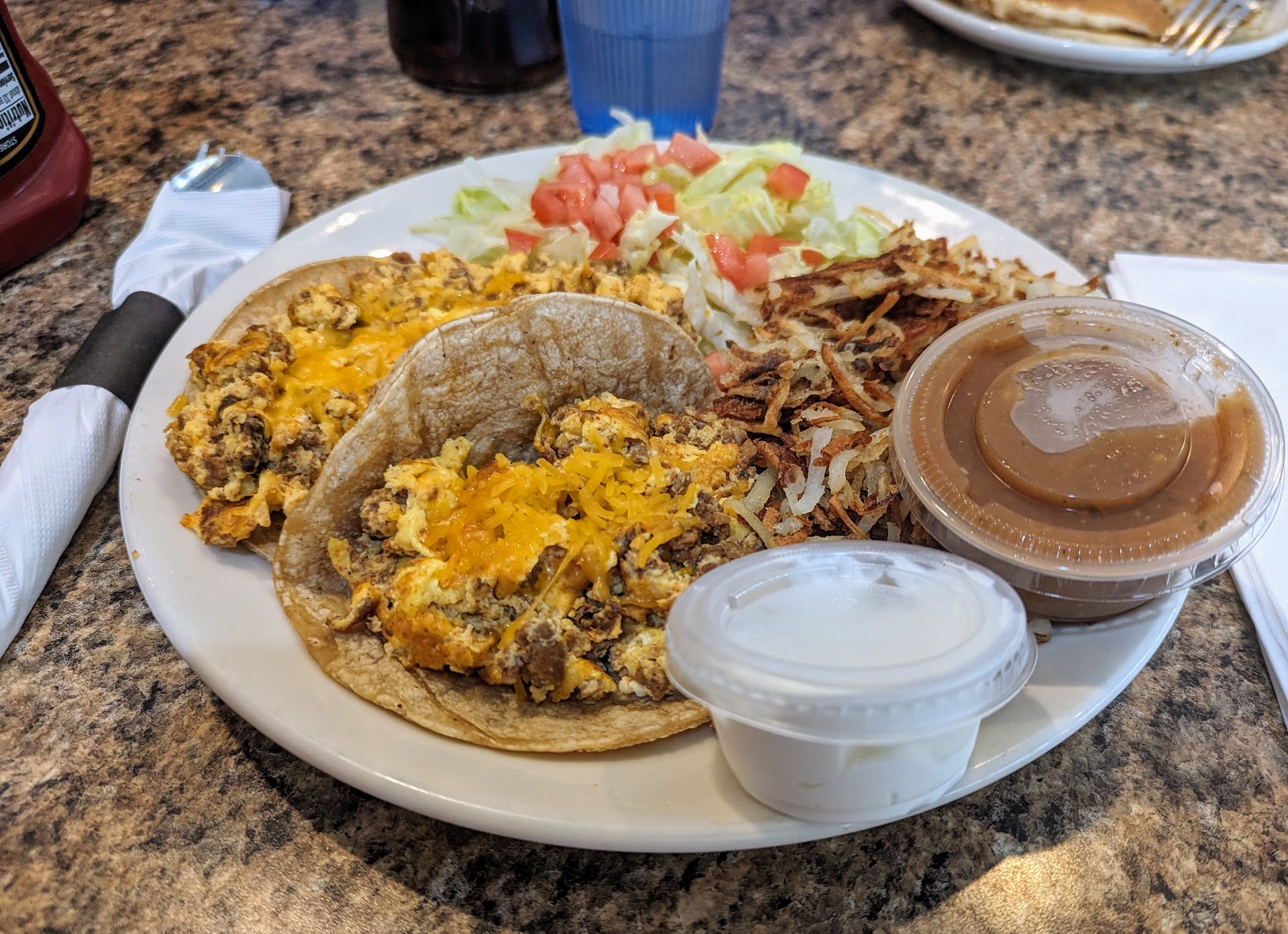 I tried something new here yesterday. I had the breakfast corn tacos with chorizo, cheese, eggs, hot salsa sauce, and sour cream. It was one of the specials of the day. It was very tasty!