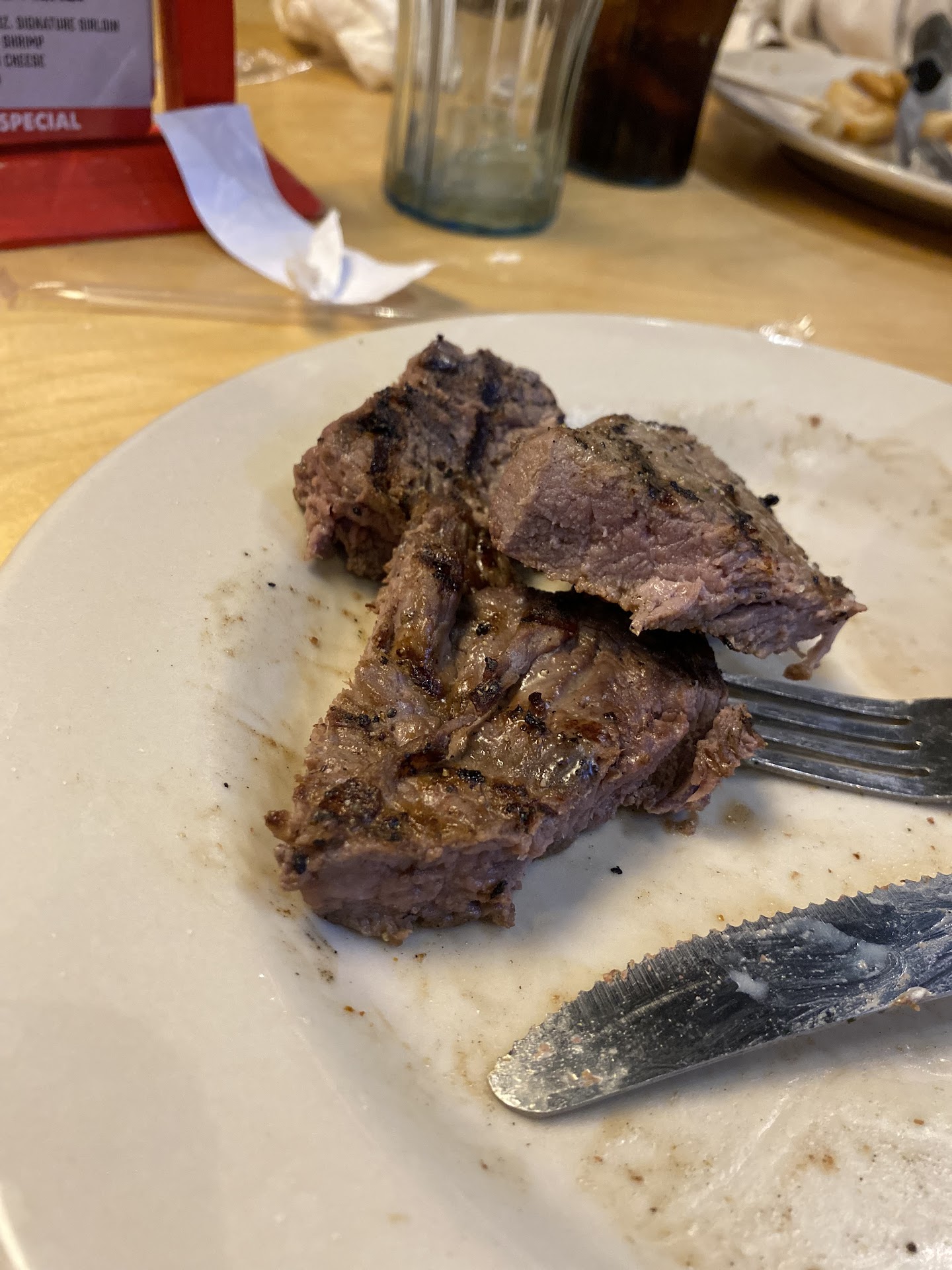 The worst dining experience at this restaurant! I like to give credit where credit is due, so please read to the end. First, upon arrival, empty parking lot, that is never a good sign. Next, waitress was promptly at our table, most likely due to the fact there was no one there. It was about 445 on a Monday, but there wasn't anyone there when we left about 6pm either. Even on a Monday, this is prime dinner hour for this area. I ordered the filet mignon with the garlic butter topping, salad, and mashed potatoes for my sides. I ordered a coke and a water, and the meal came with rolls. Almost flat soda, my water, one straw, and rolls arrived promptly. Rolls and butter were fairly tasteless. My salad had a lot of browned edges and I had to pick them out. Food arrived promptly, almost too promptly to be cooked to order, my garlic butter didn't melt as the meat wasn't very hot. I tried my mashed potatoes first, gluey and not seasoned properly. The steak was cooked ok, (again, not hot), but tasted funny. I wasn't sure it was the steak or butter topping, so I sent it back. I let the waitress talk me into getting another steak without the topping. The manager brought out a sirloin, and when I asked him if this was a filet mignon, he lied to my face and said yes. I cut into it as he requested, even though it was not sent back for level of doneness, and it cut and looks a like a sirloin. Next, I noticed something on the side of my glass, (of course, after I drank some), some black stuff. I was praying it was on the outside, but no, as I scraped the inside of my glass with my straw, all kinds of gross black stuff slid into the bottom of my glass. The waitress was super kind as she probably recites the same apologies to many customers. I asked her to go tell her manager about this. As expected, the manager never came back over and neither did she. Who knows , they probably thought I was after a free meal, I can assure you, I was not. I paid my bill with a 15% tip, I normally tip 20%, but couldn't this time. Another review said the meat tasted microwaved and I am sure it was after this experience. I give excellent reviews to all kinds of services that I receive, this place will never get my business again and I will never recommend...