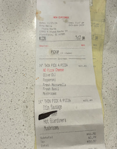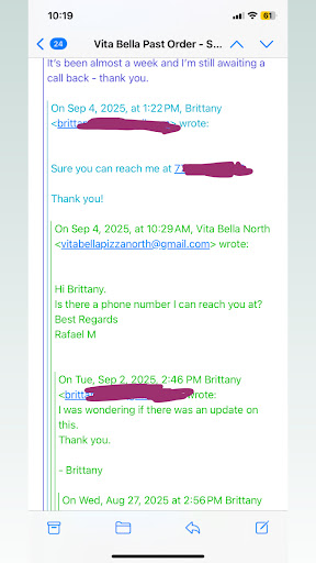 My husband and I have been loyal customers of Vita Bella for years, but I was very disappointed with my most recent order. The pizza we received was undercooked and the dough was still white when we received it. It was very cold too. I attached photos show how poorly it was prepared compared to the pizza we got back in March.