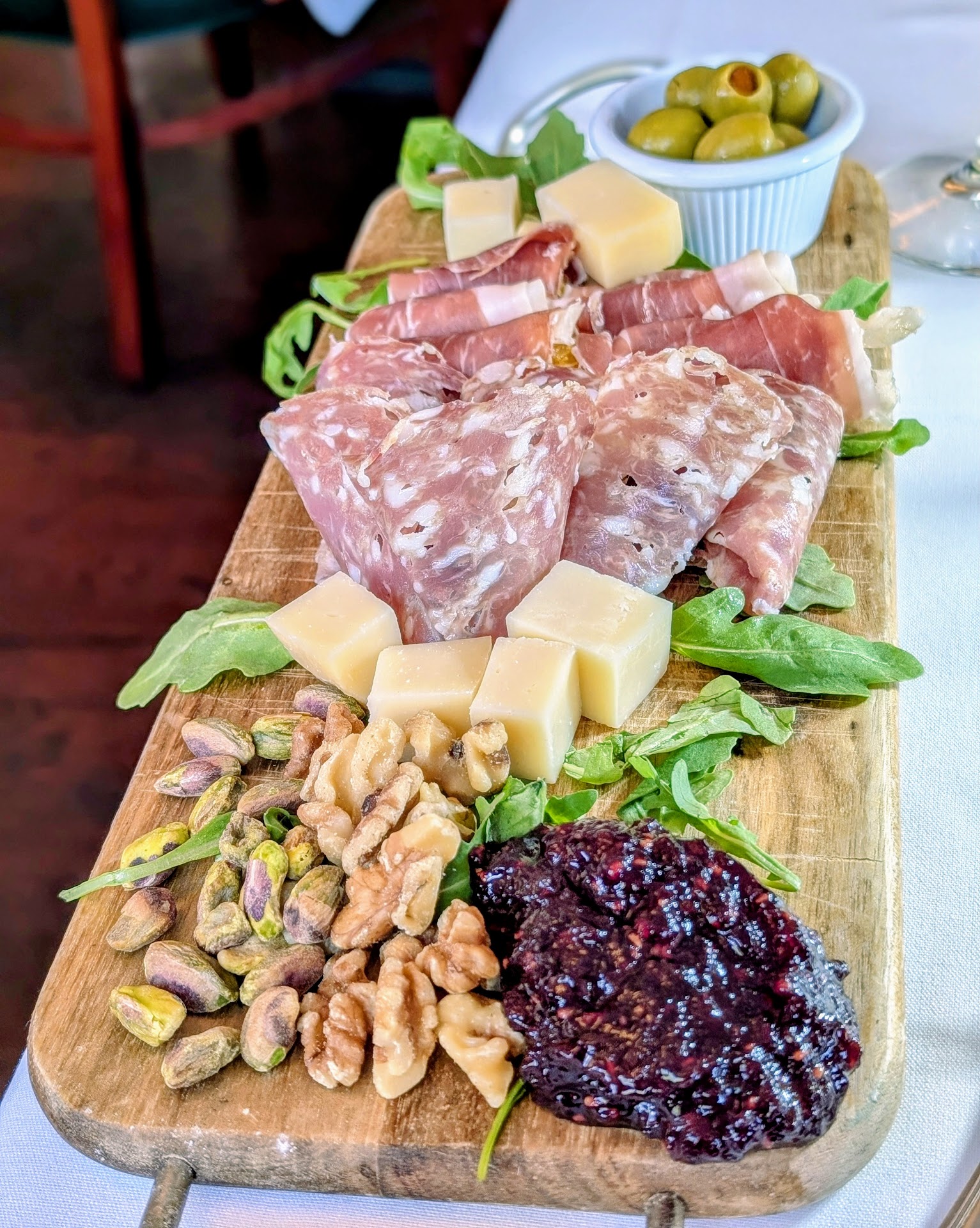 For starters, we ordered a meat and cheese charcuterie with smoked provolone, prosciutto-covered orange slices, soppressata-covered grapes, olives, pistachios, walnuts, and a savory jam. The board was pleasantly prepared, and was an outstanding start to the evening.
