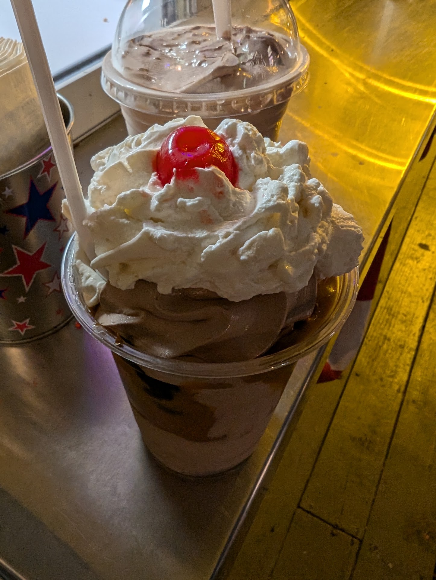 I wish I could give more stars as we usually never have issues. First, no cup holders is tough when you have a larger order. Maybe lids could help? My advice would be to use a larger cup and under fill it to meet the size ordered if you can't figure a solution out. That way, people will not have to scrub drips and sprinkles out of our cars. We were handed larger cups but no offer to help figure it out. Second, if you are on a register, you should have basic math down and people skills. We were just hustled on. We tipped still but it's ridiculous how we were treated. This is why we stopped going to the Edwardsville one too. I'm surprised as we've never had problems in the past at ANY of the other businesses (other than mentioned above). Small businesses generally like to have customers... We try to stimulate them and some...
