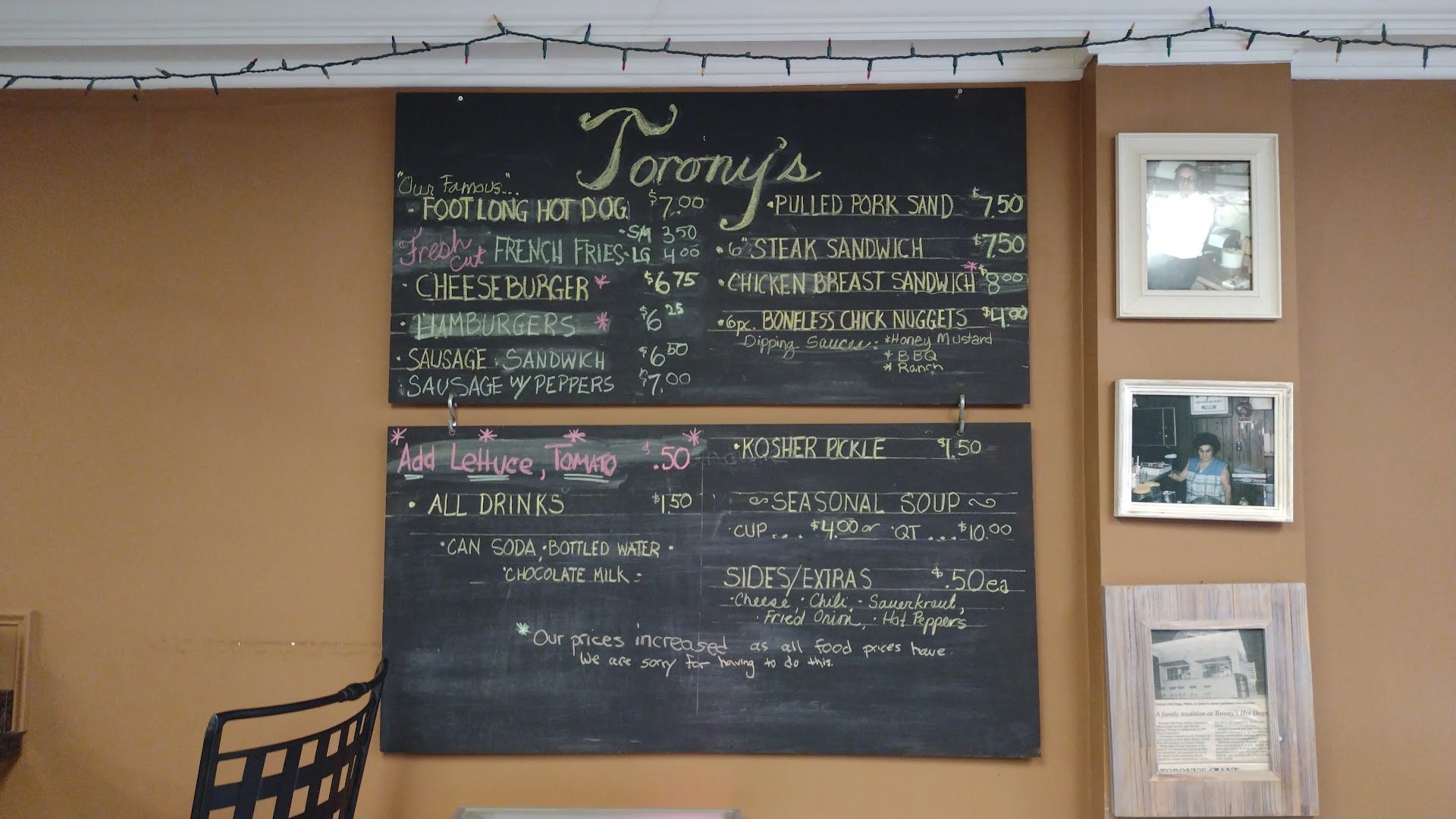 We have loved Torony’s ever since they were a tiny little hot dog stand by the side of the road in Plains! Their chili sauce recipe has remained the same for all these years and they sell the best foot long hot dogs in the area! My husband and I get the hot dogs and fries and the portions are generous. The fries remind me of the kind we used to get at amusement parks in the paper cone with salt and vinegar. Delicious and not “fancied up” with seasonings. If you want some good old fashioned hot dogs and fries, this is the place to go! They have other menu items as well but to be honest I’ve never tried anything other than...