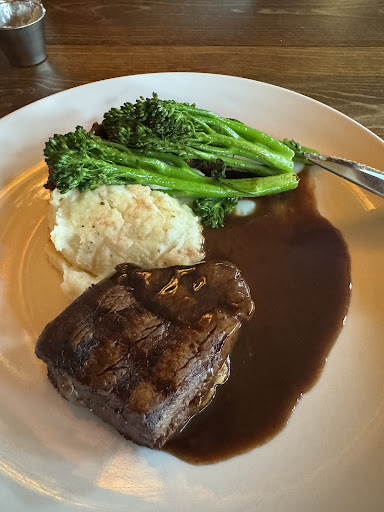 We had dinner and breakfast here during our stay at the cabin. Dinner was extremely expensive but was not worth the price. The prime rib was dry and overcooked on the edges (I ordered medium rare) and the au jus was bland, it tasted like just plain canned beef broth. We had desert and the creme brulee, a staple in fancy restaurants, was tiny and BURNT and BITTER. I swear, the stuff you can get from Costco was better. I mentioned this to the waiter, but he couldn't care less. He didn't even say sorry! I asked him to tell the chef about it.