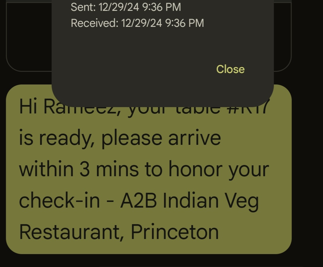 Read moreI have been to A2B many times. I went today to A2B today (8/17/24) with with my family since my great grandmother was visiting. Our waiter's name was Riyas.
