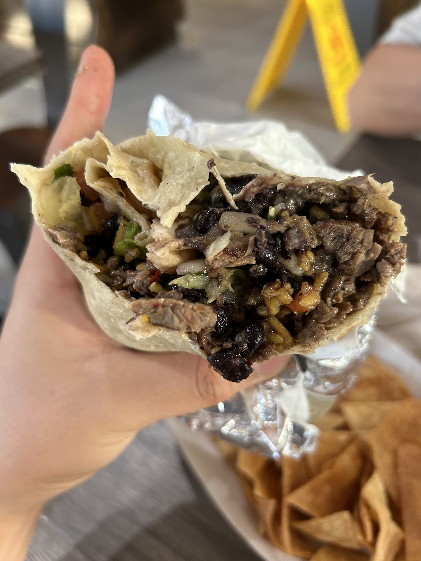 We chose a table to sit at and waited for our food. The workers behind the counter finished our items individually and brought them out to us. I was surprised the chips and drink were not offered first as an appetizer, but it didn't matter too much. The birria brisket was delicious. It was aromatic, tender, and juicy. The steak was also flavorful, with a charred/smoky taste to it, and juicy. Each entree was packed with meat, so much so that every bite had a good amount. The burrito was well wrapped and packed full with the variety of other toppings I asked for. The chips were crispy and the salsa had a good flavor mixture of pepper, tomato, and cilantro. The toppings available to be chosen included cilantro, lettuce, cabbage, cabbage slaw, pineapple, corn, tomato, onion, pico de gallo, shredded cheese mix, guac (extra charge), crushed chips (extra charge), and a few salsas & sauces. We also were able to choose our rice (spicy or garlic).