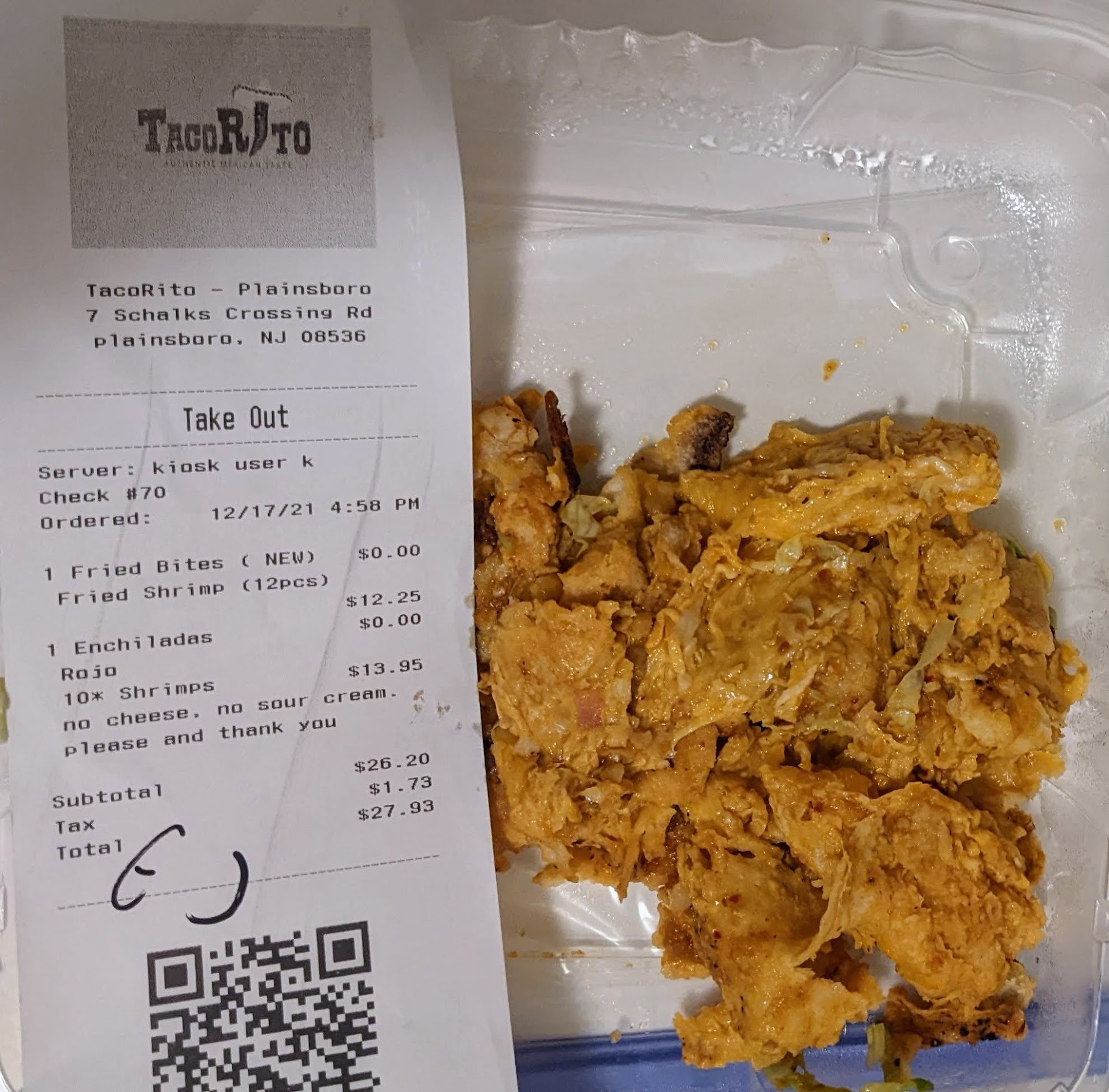 Read moreThe food at this location was near flavorless. I ordered the fried bites shrimp, shrimp enchiladas rojo without cheese and without sour cream. The only thing that was half decent were the beans that came with the enchiladas. After driving home from ordering in the restaurant, I realized they put cheese in the enchiladas. Thankfully, I guess, the cheese was glopped on and I was able to separate it from the shrimp without much effort. The photo shows the cheese I pulled out. It was not pleasant, however. For close to $30 and a trip, it was not worth it. The quality of all of the items was poor. The customer service was fine and the ambiance in the restaurant was okay, minus the loud music. It's in a nice location. I've been to the two other locations and the food at those locations tasted good. I won't be back to...