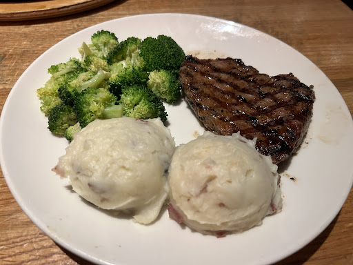 The menu was disappointing. I'm not a fan of fries with a steak. I have allergies. Can't eat the rice. Couldn't get mashed potatoes without garlic. No baked potatoes. Most places that have ribs offer add-ons of a half rack with a dinner. I could have gotten a sirloin with ribs, but I wanted the ribeye. Although, after getting it, I shudder at the thought of the serloin! Oh, and all you can eat ribs, etc being advertised, but they weren't offering it... That was why 4 in our party picked Applebee's.