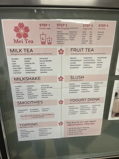 Read moreMei Tea has a huge variety of bubble teas, which you can customize yourself if you know what you’re doing. They also have a few snack options, but are primarily a bubble tea shop. They have a menu on their google page if you’d like to have a look.