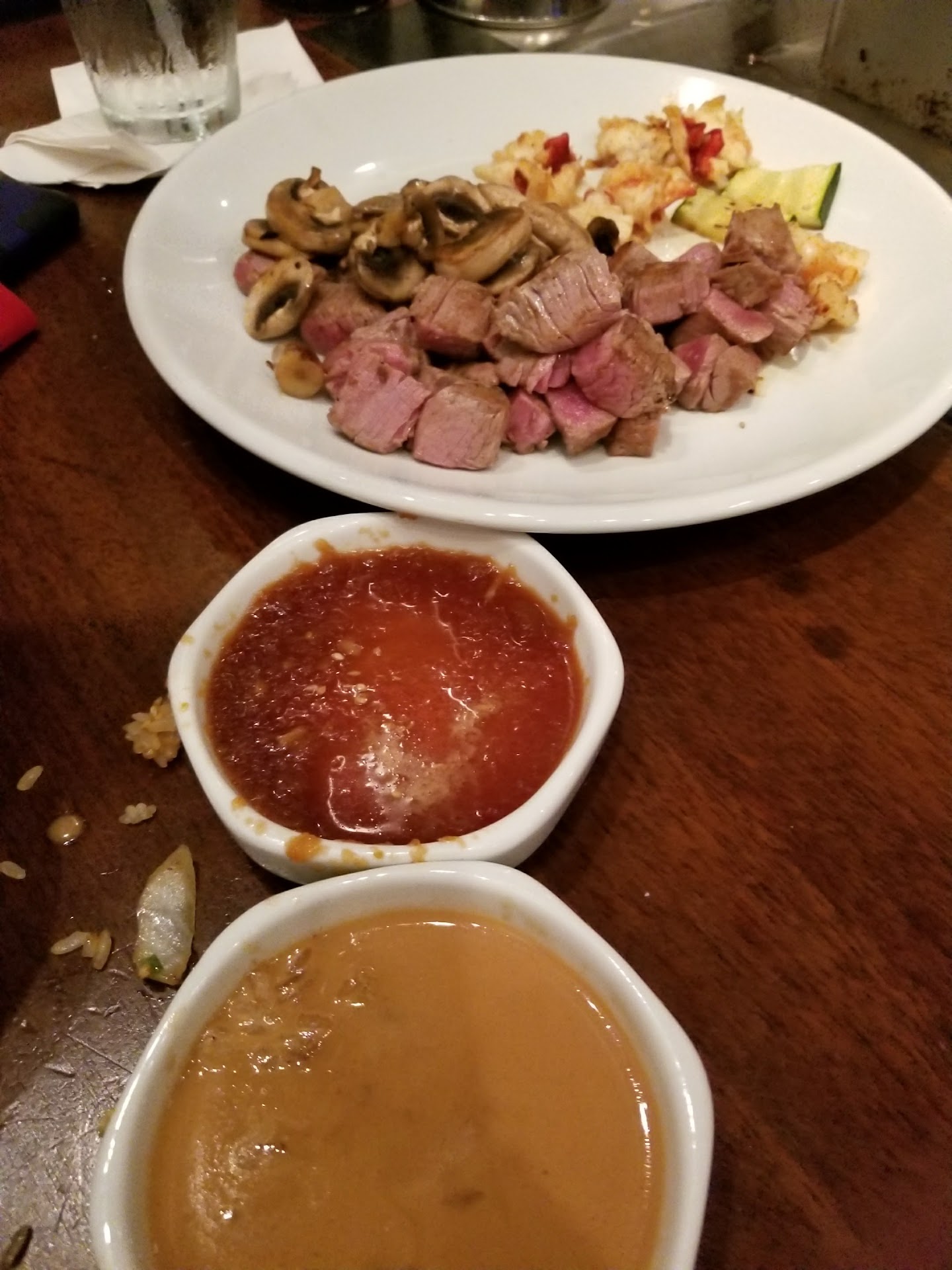 The steak fried rice was no better. The steak seemed like it had been pre cooked in bulk. It reminded me of Chipotle when someone orders steak they are scooping it out of a stainless steel container. It certainly did not taste like it was just cooked for our order. The steak was heavy in pepper flavor. The steak fried rice also not a single vegetable in it.