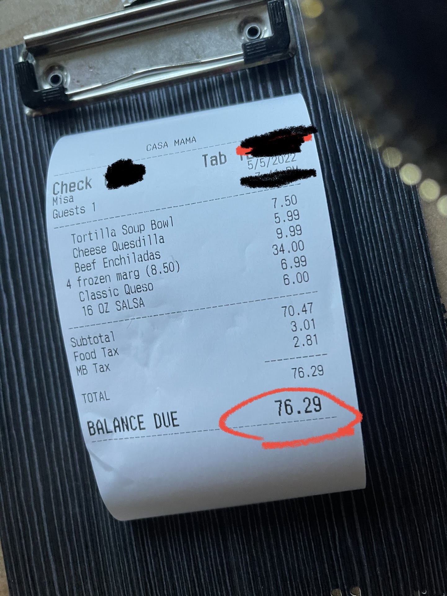 Read moreWe haven’t been to Casa Mama in a couple of years, not for any specific reason other than there are more places closer and just as good (from previous experience there). Today, based on the recommendation of a friend, we revisited with positive expectations. Boy, were we disappointed. The service was the worst part. It was about 2:30 and they weren’t even busy. The server was un-attentive at best. We had to flag the manager down a couple of times, who even realizing we were not getting good service, was almost as unavailable. Drinks - I ordered a beer-rita ($14 by the way) and it came out with half a pour of frozen margarita and ⅔ of my beer (a small Coronita) being already added. So it was already mostly beer and melting. If you drink beer-ritas, then you know this is not normal. My wife’s unsweet tea tasted old, like it was made in a dirty coffee maker. The “Queso de Casa” for $7 was more like a small cup. And the corn tortillas we ordered, one of the looked molded. The Sanchez fajitas were literally 3 pieces of chicken, 3 pieces of steak (1 way overcooked) and 2 shrimp. And back to the service….we tried to flag down our server multiple times, even watching him eat his lunch at the bar, never making eye contact. We were out of salsa, the first batch of chips the brought us was stale, etc. Then when the check came, the server was all nice and congenial. And yes, I was going to say something to the manager on the way out the door, but he was nowhere to be found. ...