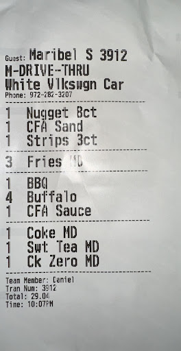 Read moreWorst experience Iâve ever had at Chick fil A. First time at this location because the one on Renner is closed for remodel. Iâll never be back. I placed 2 order because the site wouldnât allow an order over $100. When I arrived for pickup ⌠atleast 3 workers walked right past me⌠didnât say hello or ask if I needed any help. One of the reps finally came by and asked if I needed assistance. I advised I was there to pickup. He looked on the computer and claimed my orders werenât in. I asked him to look againâŚ. He then found 1 ⌠apparently the other one didnât come through. Instead of asking me if I wanted to place the order again⌠he just walked awayâŚ.. he comes back maybe 2 minutes later with the first order I placed and places it infront of me. I ask him to return the order as my second order didnât come through and I need to place it however the food would be cold by the time they prepared the second one. He grabs the bags and walks off. I place my second order online and I call him over to check the system for it⌠itâs there ⌠they make the order ⌠and bring over the bags âŚ. No apologies âŚ.. no thank you. If it were just my good. I absolutely would have gone elsewhere. This location has the worst customer service Iâve ever received at any Chick fil A. Not to mention my salad wasnât even fresh. The lettuce looked like it had been sitting for a long time and the strawberries werenât good. For someone whoâs buying almost $200 worth of foodâŚ. I donât...