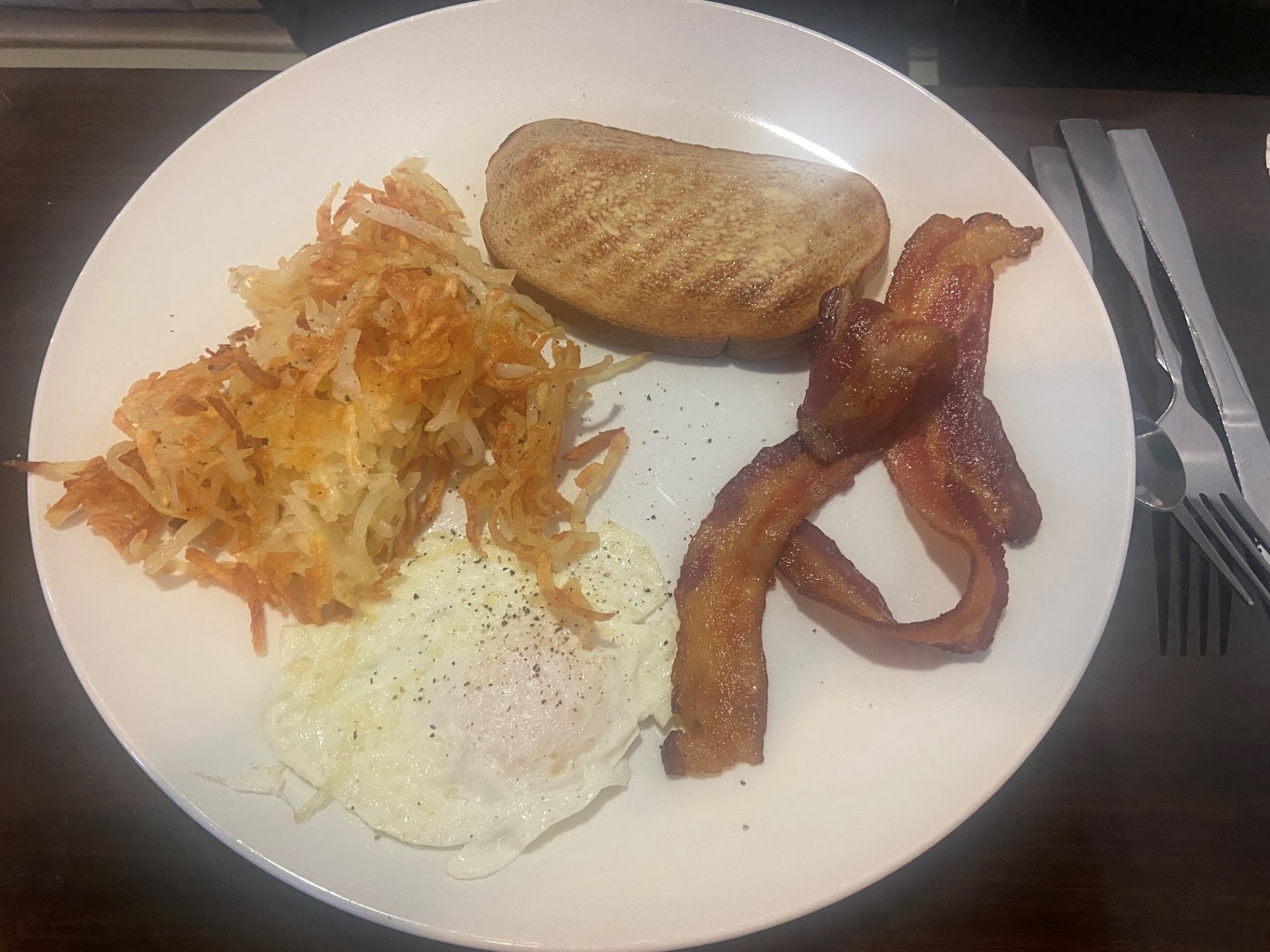 My wifeâs plate was also uneven. While she liked her rye toast and fried egg, her bacon was fatty to the point that she only ate one of the two pieces. She didnât eat but a few bites of her hash browns because she has an aversion to the âfried in old oilâ taste. FWIW, I recognize that taste from working in an IHOP long ago while in college. The cooks would use the same container of an oily butter like liquid on the griddle for just about everything that might stick, and this is the taste you ended up with after the same mop brush was used over and over on the big griddle from that same container.