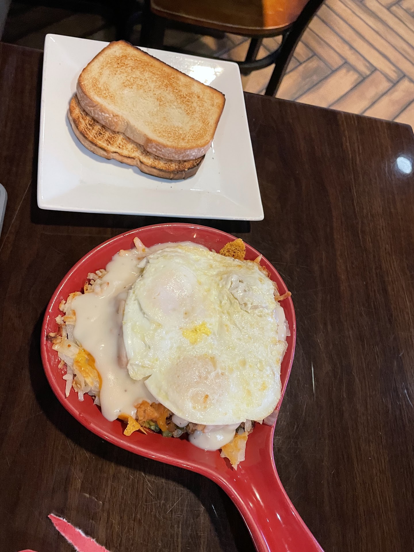 We tried Eddieâs for the first time in a long while. While the service was attentive, the quality of the food was uneven. My pancakes were good, but the biscuits with sausage gravy scramble bowl was a letdown. There was almost no meat, and the hash browns had an unpleasant taste like they were fried in old oil. That taste overwhelmed everything else in the bowl.