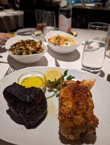 My 12 oz filet was cooked to absolute PERFECT (Medium rare +) and the lobster tail I added was HUGE and also cooked to perfection. My wife raved about the scallops she had as well as the heirloom salad. She said the fresh mozzarella on the salad melted on her mouth and the dressing was perfect. My wife asked for some bƩarnaise sauce for my steak, after it arrived, (because I can never finish a whole steak by myself) and 2 different people arrived within a minute to make sure we were completely taken care of). Our sides of (plain) mashed potatoes and asparagus were also perfect. Some of the best asparagus we've ever had at a restaurant.