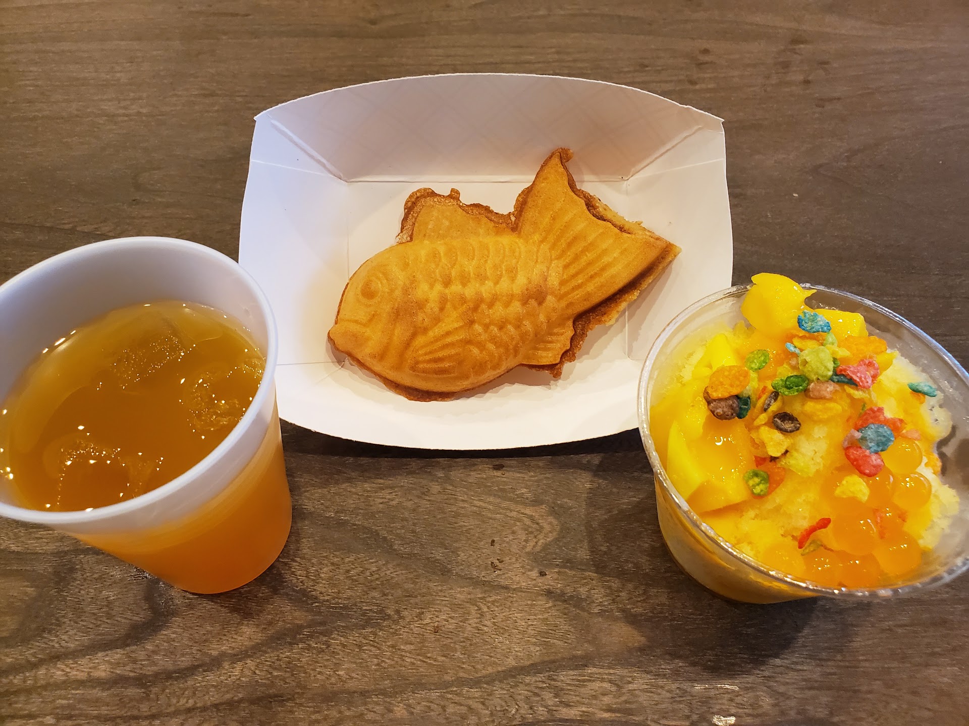I got to sample three different items: Passion Fruit Green Tea @50% sweet and light ice. Heavenly Shaved Ice with real pieces of Mango and Fruity Pebbles as topping. Tayaki with Custard filling.