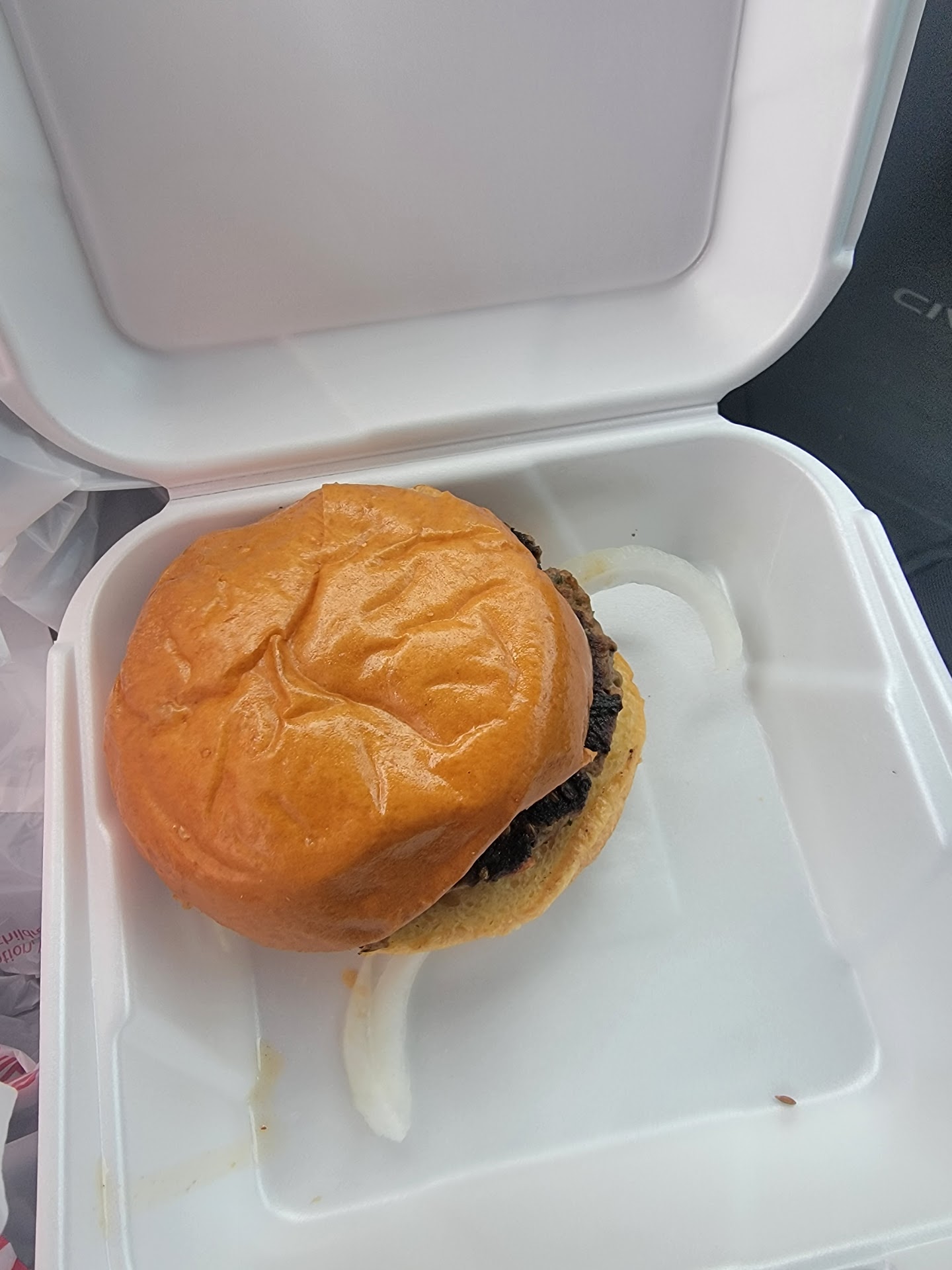 I got home and took a bite out of the "burger" to find a mouth full of unfitting flavors. This was an indo-pak'esk kebab dressed (barely) as a burger. The flavors weren't bad alone, but together, wasn't an ideal meal. The sweet flavors of the grilled bun didn't pair well with the savory and spicy flavors of cultural seasonings. The burger was dry for the most part and really needed some vegetation to compliment the kebab. A light padding of lettuce would of done the trick. I couldn't finish it as my first bite had what was either the driest piece of fennel I've seen or a stem from some veggie that was definitely not in my burger. I found hard bits of what seemed to be beef cartilage. But it was large enough to make me not want to finish it and gave me an unpleasant experience with the...