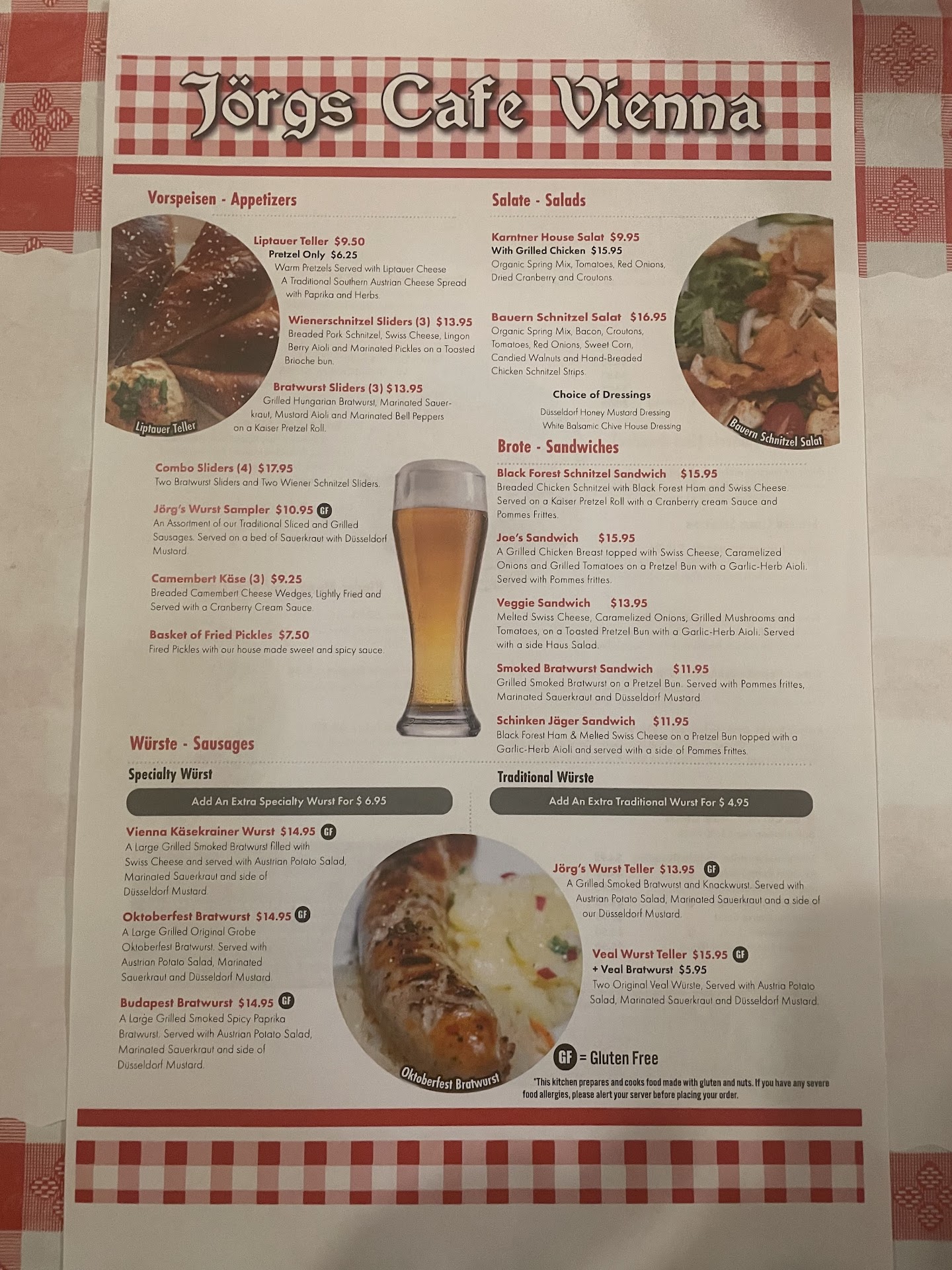 We shared our 43rd anniversary dinner at Jorg's on a Friday evening. We chose a austrian restaurant because we both grew up in a german/polish home & lived in Germany for over 3 years so we missed our native food. Austrian food is very similar to german food, just not as heavy. We made last minute reservations for 7pm. We showed up 30 mins. early and we seated promptly. The atmosphere was lively & relaxed, a little too loud for 1 on 1 private conversations ( my only slight complaint the entire evening) but it was not irritating in any way. Tables were pretty close together, but it reminded us of authentic Austrian restaurants in Vienna. Our waitress, Laura, was fabulous- prompt, informative & friendly. We ordered a variety of food items from each part of the menu just to sample as much as possible and portions were so large we took home a box full of leftovers to enjoy the next day. Appetizers: The wurst sampler plater was delicious w/a variety of white & red wurst, some with extra spices. It included a nice portion of the best, lightly spiced white sauerkraut I have ever had & a generous portion of spicy brown mustard. The fried Camabert cheese wedges were more than ample for 4, with the most delicious dark red, creamy raspberry sauce. The dish was almost dessert-like. For the main course, I had the weiner schnitzel w/2 different sauces (Franz Josef & ceamy onion gravy). Both sauces were light, creamy & perfectly flavored- not so overwhelming that it hid the flavor of the meat & spaetzel. It came w/ austrian potato salad & I ordered an extra side of spaetzel which paired perfectly with my sauces. My husband ordered the Hungarian Goulash w/spaetzel & he was delighted- the 2nd best goulash he has ever had the 1st being in Germany. For dessert, we had apfel streudel & bread pudding souffle. The streudel was perfectly authentic, w/vanilla rum cream sauce. The bread pudding souffle, however, was to die for. Served with a side of sweetened rum cream sauce, the dish was lighter than most bread puddings, but so flavorful with fresh almonds. This dish would win awards in any contest it entered. We were so pleased to try this restaurant- it made for a perfect anniversary dinner. We highly recommend Jorgs for any celebration or date night. Customers ranged in age from early 20s to late 80s. It appealled to everyone. Reservations recommended to guarantee a seat at the time you...