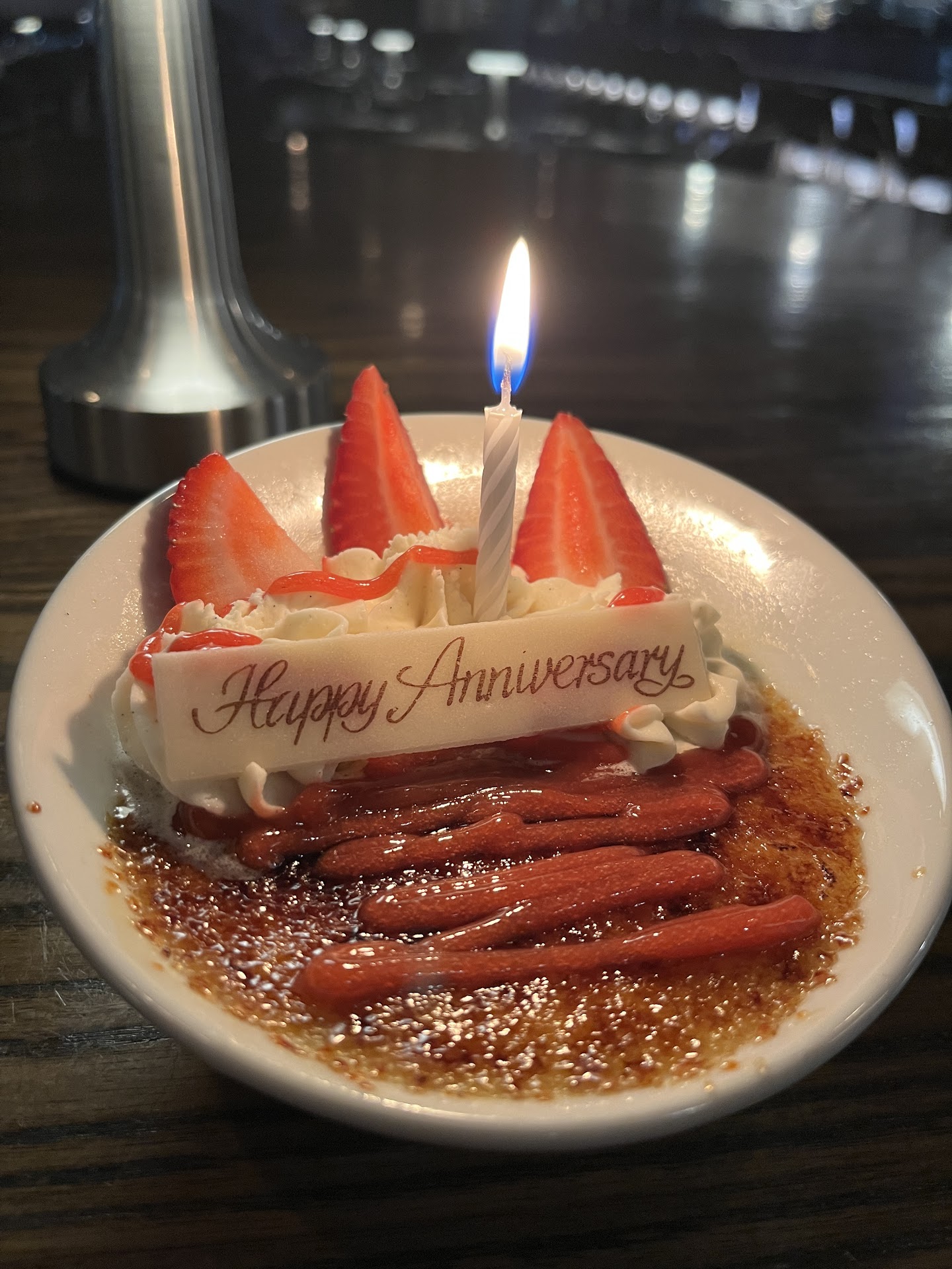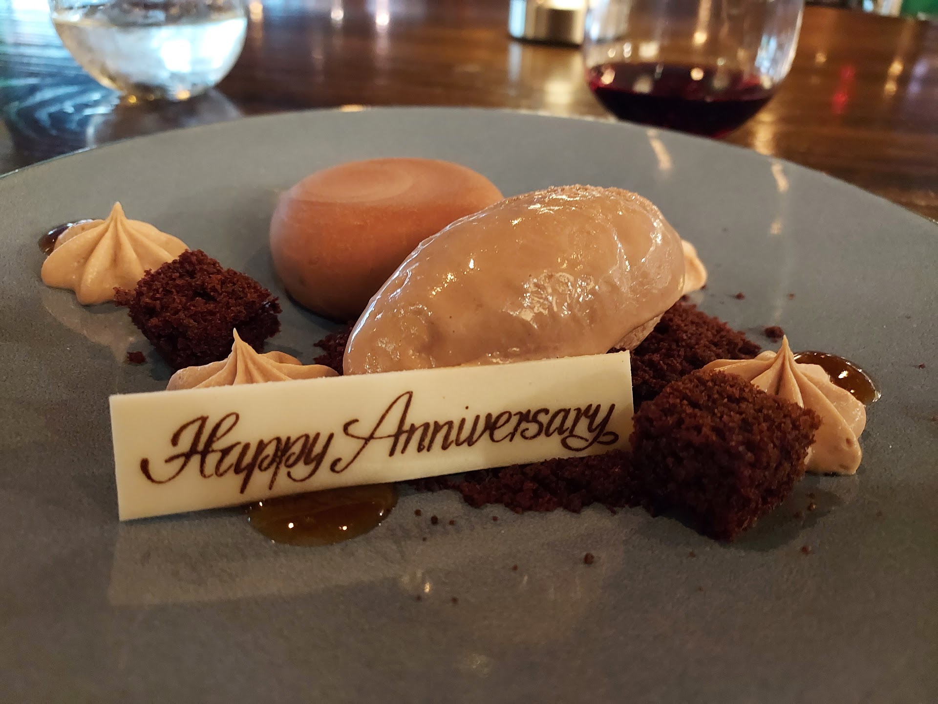 While I was away, the waiter came by and asked my wife if she wanted things to be boxed up. She told him I was almost here and that I might want to finish up, when he pointedly looked at the watch on his wrist. He had also asked her if we wanted dessert and at that time she ordered dessert for me as well, since we were celebrating my birthday.