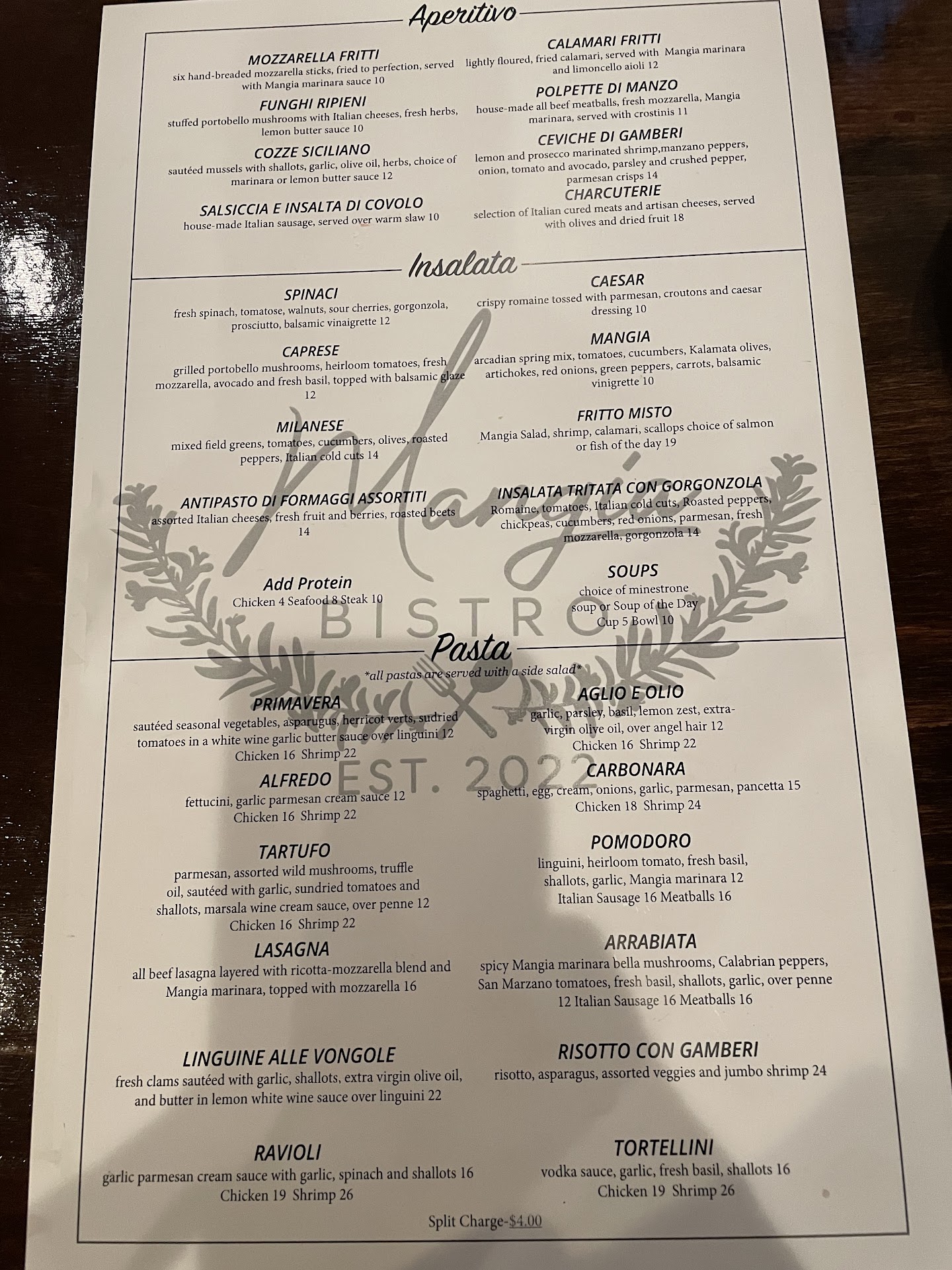 Read moreI come from a NY Italian family so my expectations for Italian food are high. I wish it were possible to give 3.5 stars. Favorites include Miss Pasta, Mio Nonno, Numero 28, Roman Cuccina, Pizzaria Testa, Taverna and a couple others. We visited Mangia on a Saturday evening for a quiet birthday dinner. It was the first time so we made reservations via their website. Never received a confirmation email or text but when we arrived, it was obvious that a reservation was not needed. Very few tables were filled and many of the diners appeared to be retirees. Service was good. The server seemed inexperienced but he was attentive and got the job done - nice young man. Ordered Mozzarella sticks: the consensus was that they were probably a frozen product but not as good as supermarket quality, breading was very bland and the sauce was average. Meatball appetizer was good, no complaints on the red sauce. Biggest disappointment was the Caesar salads. Each of us ordered as part on the entrees. The lettuce was fresh but the dressing was HORRIBLE. Very thin/watery and did not taste like true Caesar dressing. I ate half, the other two were sampled and rejected. The entrees were good but not amazing (Tartufo, Fettuccini Alfredo w/chicken & Chicken Saltimbocca). Flavor, portion size and sodium level were perfect, each of us left with some extra food. Pasta was slightly overcooked but did not bother us at all. We ordered dessert to finish the night (Lemon cake, cheese cake & creme brulee). No complaints again and we ate as much as possible. Atmosphere was average, it didn't feel like an Italian restaurant. Prices were very good considering how much inflation has impacted most restaurants. Overall, a good but not great experience. I don't believe this place will make the list of our favorites but may try again in the future. Must fix that...