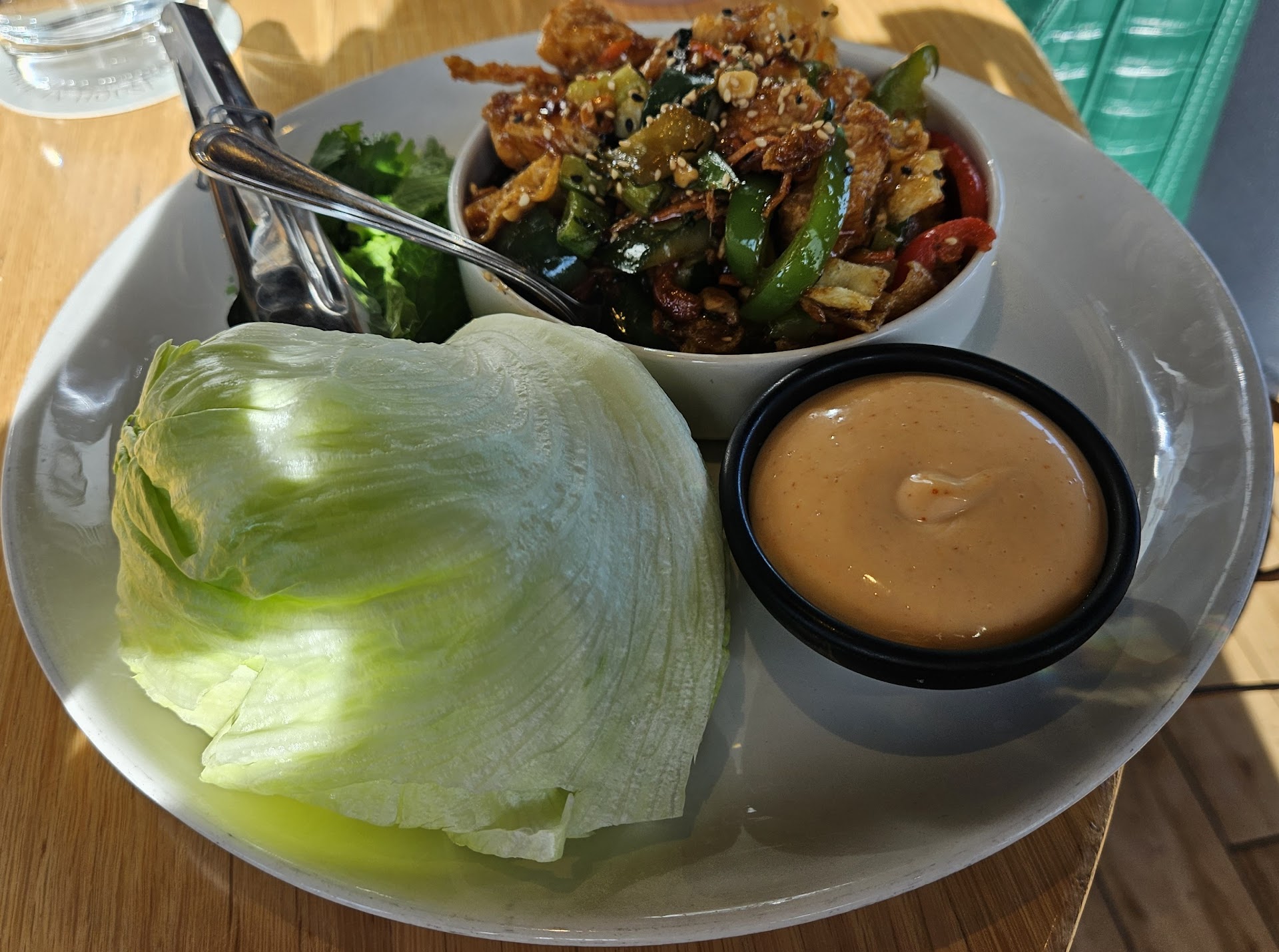 Once we sat down we were greeted by Ron who was friendly, attentive and offered great suggestions. I had the Cashew Chicken Lettuce Wraps for the entree and I loved them! Perfect flavor so I didn't even try the spicy mayo sauce with them. My friend decided on the The Cheeseburger which she said was really good. I loved the ambiance inside and in perusing their menu it appears they have some really unique and tasty sounding drinks, which I may come back and try during one of their Happy Hours.