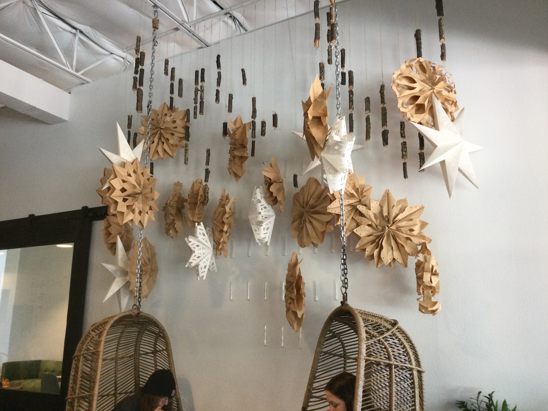 I love how each place has a moment of visual interest, as well as different zones. At the front of the entrance there are hanging chairs with a fun star constellation, Live edge tables and a geometric wall divider. Directly to the right is a space that has a sliding barn door that can be reserved. A quick peek in there shows a spacious table as well as fun artwork. The Conference room can be reserved by the hour.