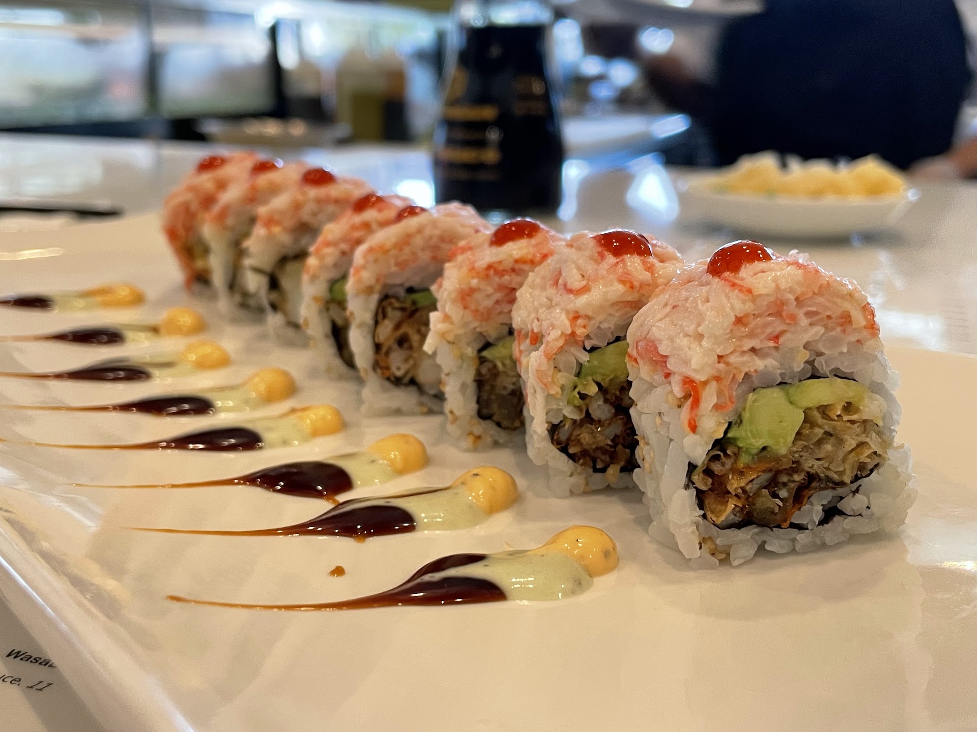There was no bartender so we sat at the sushi bar instead of the bar. It was interesting to watch food being prepared but no one interacted with us or even served us which was odd. We had a waitress but she would stand at a really odd place so we had to turn around to interact and she never knew when we had a mouth full of food.