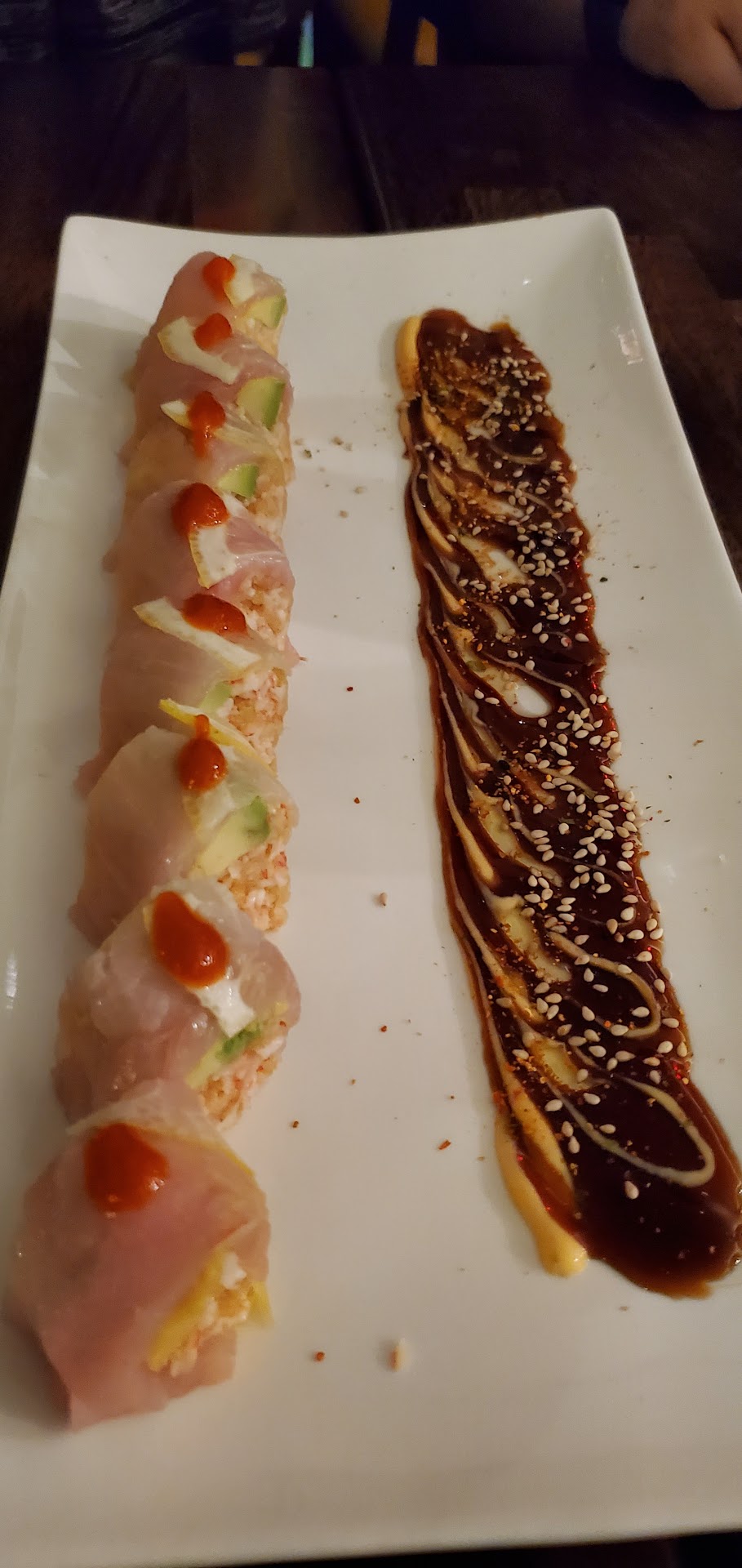 We did enjoy the atmosphere and trying a new place out until the very end. While we were wrapping up, a hostess came over to us and made us move down one seat to accommodate a new party of two. Normally, no big deal. But the entire sushi bar was open except for one other couple. So we had to move all of our stuff over, move seats, and have a huge ordeal instead of the hostess waiting about 5 minutes for us to tip out and leave or sit the duo over a few chairs. That was absolutely ridiculous.