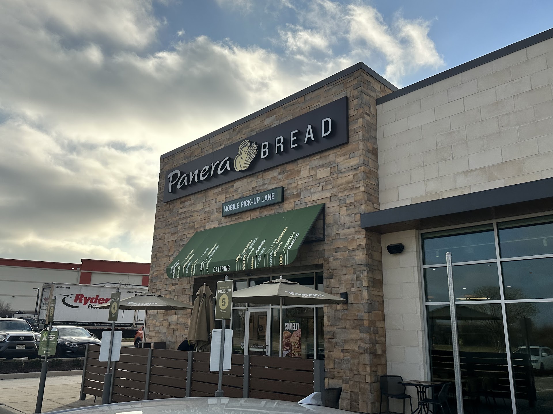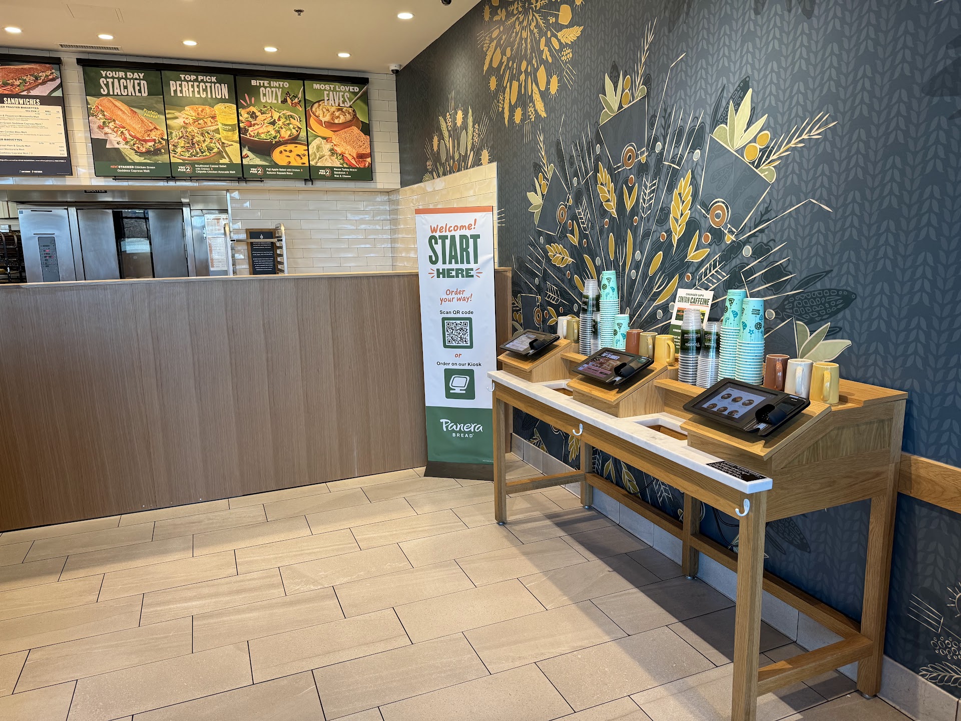 This specific Panera was a huge disappointment. Customer service, which used to be a huge deal (I worked here in high school and they drilled it into my head). With the kiosks, youâll have employees working behind the desk that will just completely ignore customers. I walked up to a customer to let them know to use the kiosk as the employee was pointedly ignoring her. The staff making food wouldnât make eye contact or speak to me either when I picked up the food. The food itself was below average - my French onion soup was lukewarm, my wife couldnât finish her wilting salad, and my daughterâs sandwich felt like it came out of a microwave. There was food and trash all over the floor/tables and the restrooms were gross - both menâs and my wife confirmed the womenâs. To top it all off, big olâ cockroach right as you walk into the restrooms.