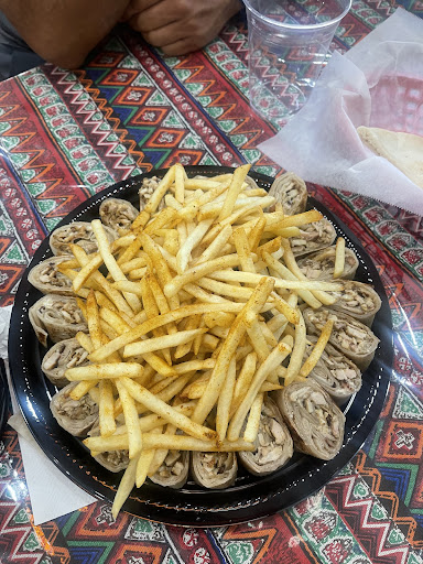 However after ordered our food we quickly became disenchanted with the quality of the restaurant. Since we had a family size group we decided to order the family meal since we have great success with family meals at Mediterranean places in the past. I wasn't too hungry and thought I'd just eat pita and baba ganoush so that is what I ordered. My husband wanted something extra so he ordered the lamb kabob. First came the baba ganoush(not pictured) it was drowned in oil and the pita served with it was cold, not a good start. Next came the chicken shawarma platter, the best part of the platter was the fries, the wraps taste like frozen food that was reheated and they looked nothing like picture on the menu. The exterior of the wraps were almost grey in color and didn't have the typical light and crispy texture that they normally have at any decent Mediterranean place, and they were soggy and dripping in oil. Last came the puny kabob tucked into a piece of pita bread(not pictured), which was an odd and unappetizing way to plate food. In addition, kabob was chewy and lacked decent flavor. My kids were hungry so they ate the greasy food all the while raving about the place we went to in Richardson the week prior.