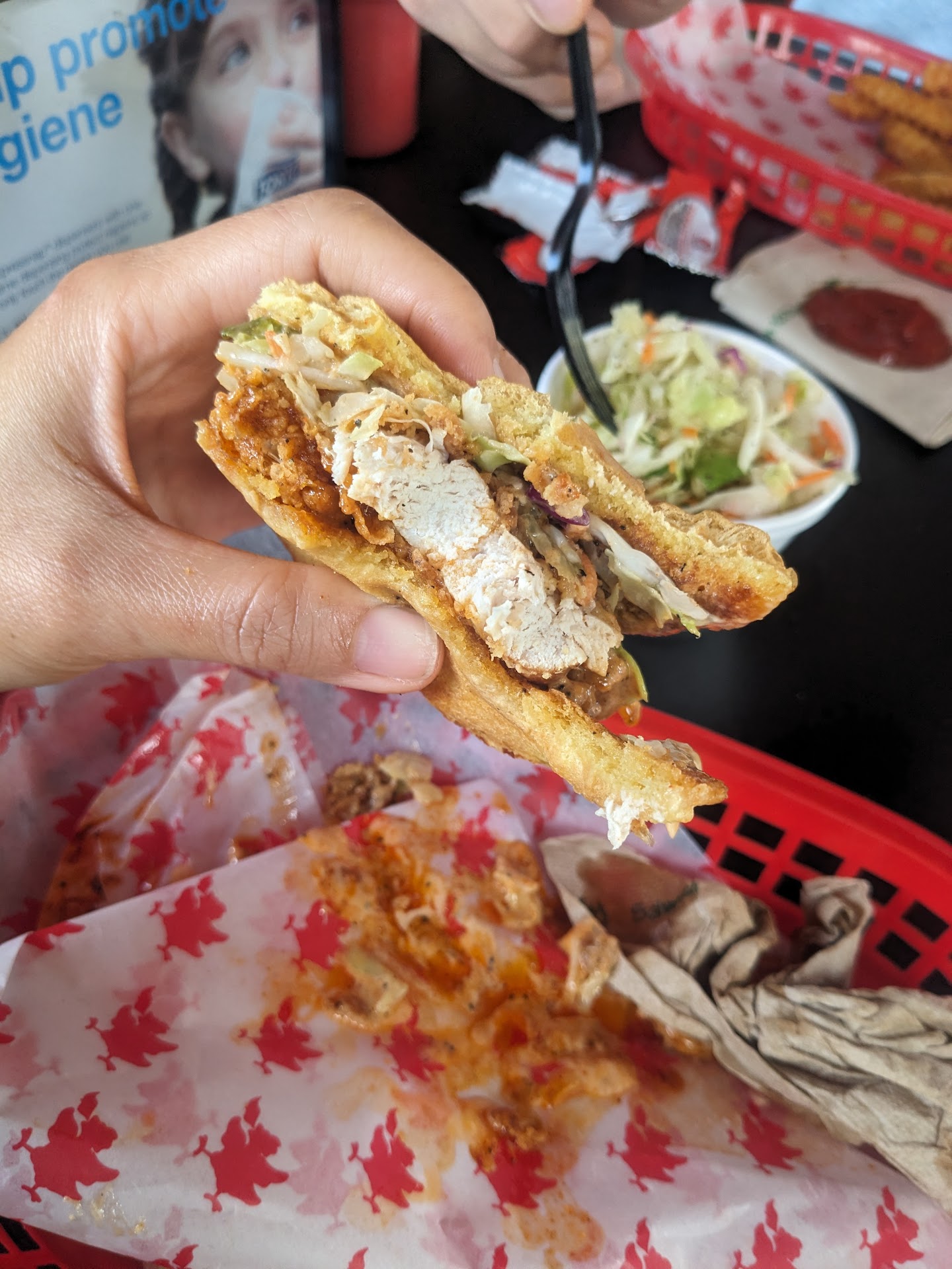 The prices were good for a chicken place (side and drink with sandwich for $12). Everything about the meal was deliciousā¦..EXCEPT the chicken itself š unfortunately my husband and I both had the driest, hardest pieces of fried chicken breast in our sandwiches. The first bite and both of us were disappointed. I continued to nibble on the sandwich (the bun, slaw, sauce and pickles were great) and my hockey puck chicken ended up just falling out of the breading š¤¦š¼āāļø