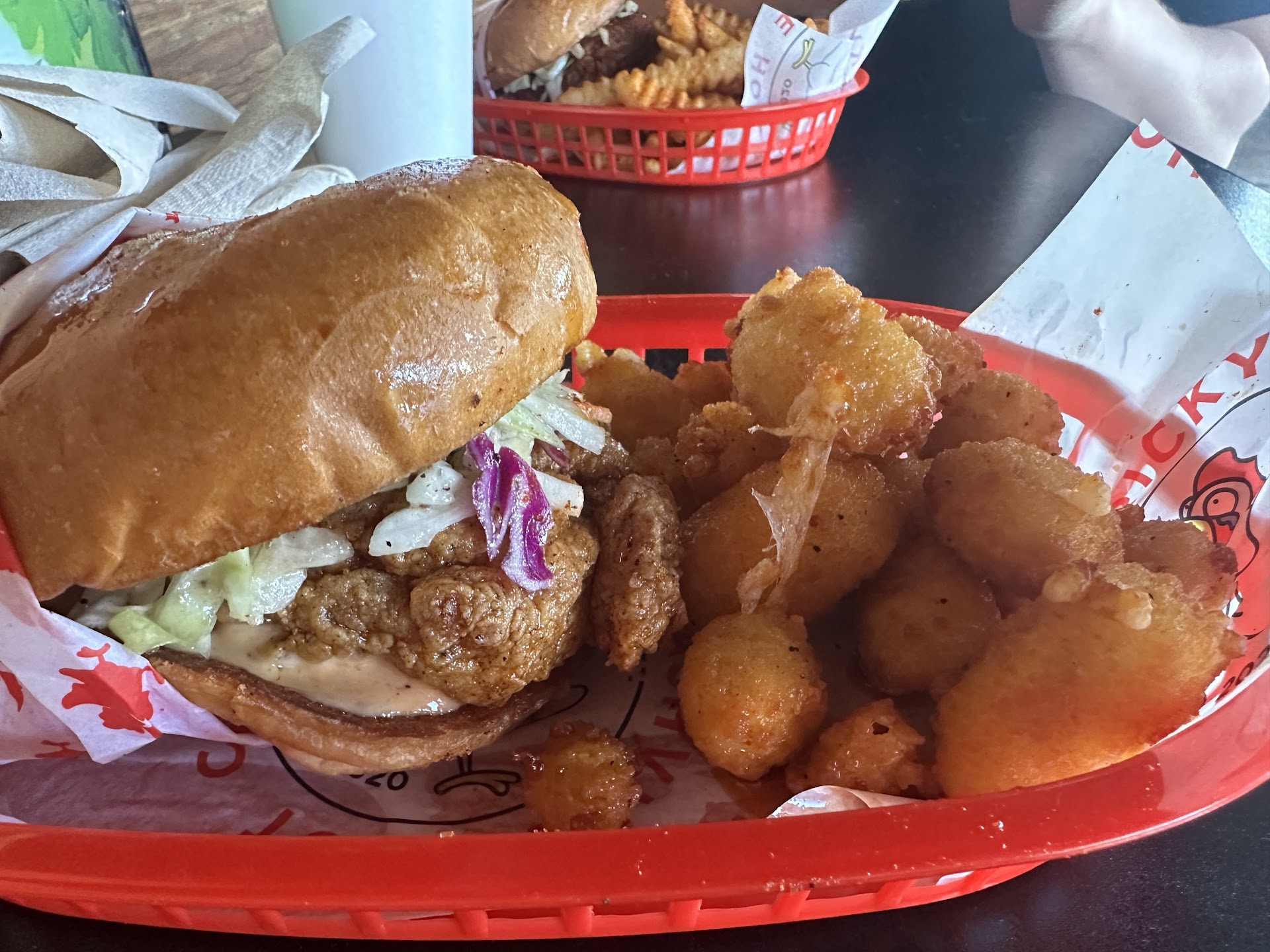 It was recommended that we order spicy level one below what we think we want, so I went XHot instead of Atomic. Even still, the guy at the counter seemed skeptical, especially after we told him we'd never been there before. I assured him I was a heat freak. I get it, man. Don't want to put the basic white dudes who visit on a bad footing so they never come back. I am no basic white dude. Well, I mean, technically, yes I am, but metaphorically I'm in a whole other level. And let me tell you: that spice level was ON POINT. My favorite combination of solid heat and great flavor. I lifted the lid and you know how some spicy foods will tingle your nose hairs? Yeah, it be like that. The chicken itself was perfectly crispy and deliciously juicy. I got the Bird's Nest and it was fantastic. The slaw has a great flavor and crunch, and the fries are outstanding. The sauce was pretty good too.