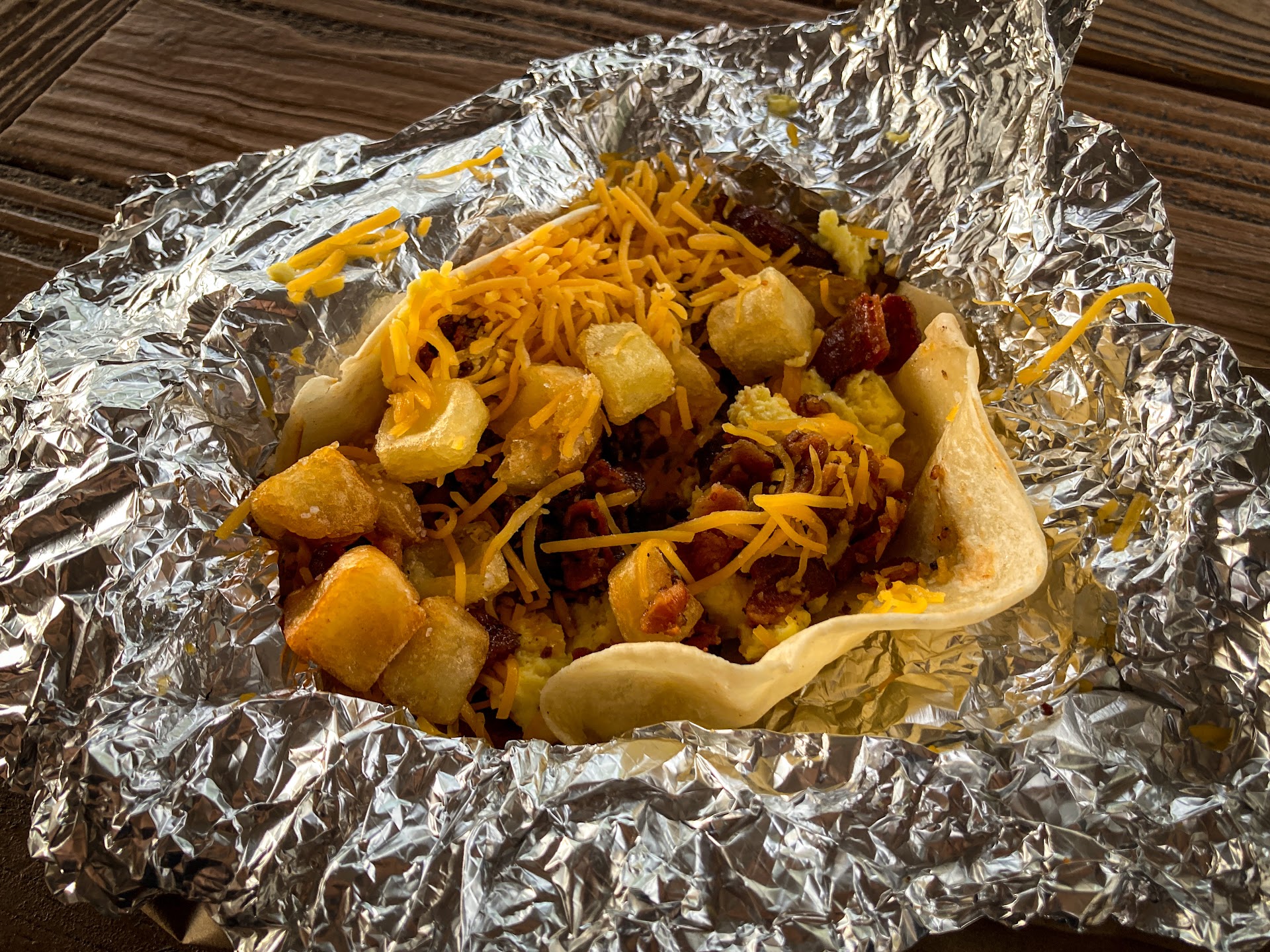 If youâre looking for more recommendations, my favorite standbys include: the Baja shrimp (on corn, and I top with some lime, red salsa, and green salsa) The pork with pickled red onions and cojito cheese (on corn, top with green salsa) The brisket taco (on flour, sub out the raw onions for grilled onions, top with green salsa) Breakfast taco with egg, chorizo, cheese, add potato (on flour, top with red salsa) I should add, my 16-yr-old son is also obsessed with the chicken fajita taco.