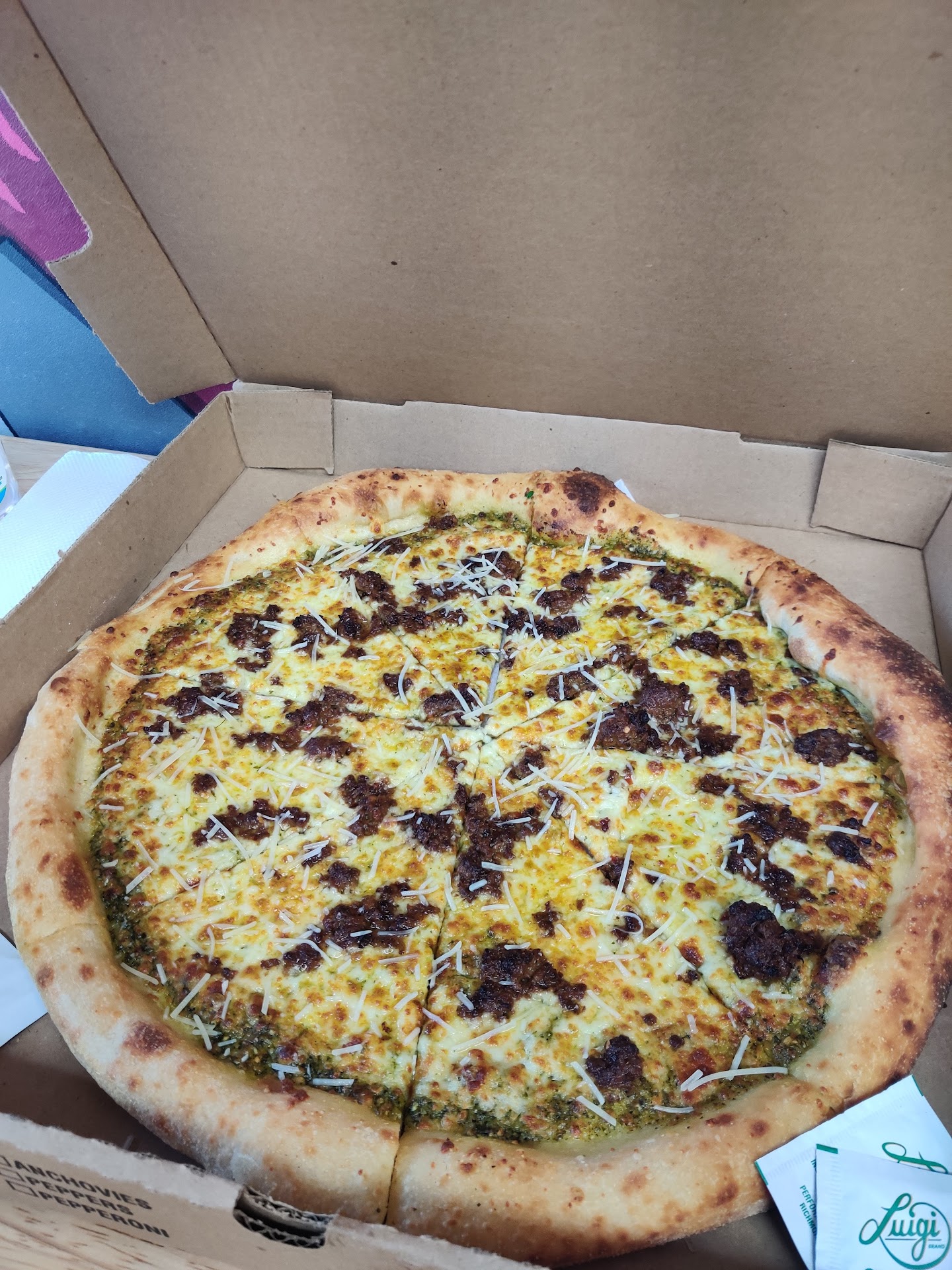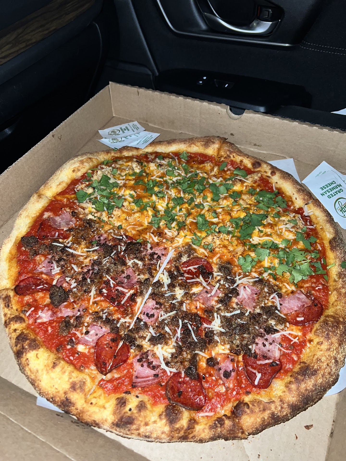 Decided to check out this place after seeing all the rave reviews and photos. Was not disappointed! The ordering process was quick and easy, and the pizza was ready within 10-15 minutes. The owners said every meat item on their menu is hand slaughtered halal, so that’s an extra plus. Since we couldn’t decide which specialty pizza to try first, we decided to do an X-Large (16-in) half and half with 1/2 Spicy Chicken Naga and 1/2 Meat Lovers.