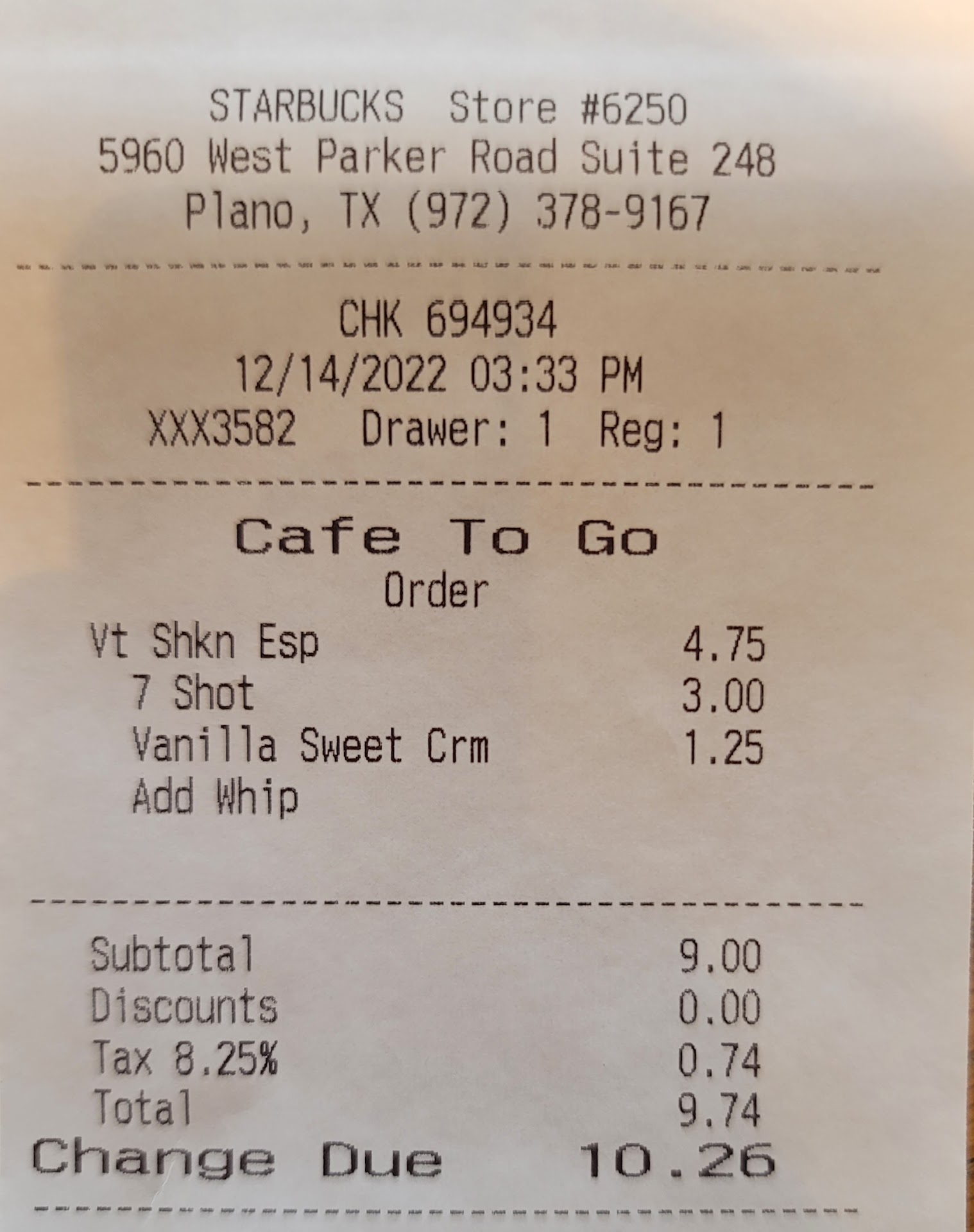 I went to the Starbucks inside of Target 2 days in a row. Both days I got the large iced shaking espresso with two extra shots of espresso. It was $7.31 I go into the same location the very next day and request one extra shot and suddenly the price of my drink jumps upwards. One extra shot of espresso changed the price of my drink by more than $5. I explained that I just went to this store the past 2 days and got the same drink minus one shot for $7.31. The cashier argued with me while her manager stood behind her and confirmed everything she was saying. I told them in a less polite way "thanks but no thanks". I drove one mile down the street to a REAL Starbucks. There is my receipt. Apparently not only the employees need training but the managers do as well. If any Starbucks managers at this store want to look at this, try training the employees inside of Target to run like a REAL Starbucks. The one right down the road will gladly give you lessons. The address is posted on the receipt...if you want to drive over there and ask them how to do your job. It's pretty crazy that one extra shot of espresso would...