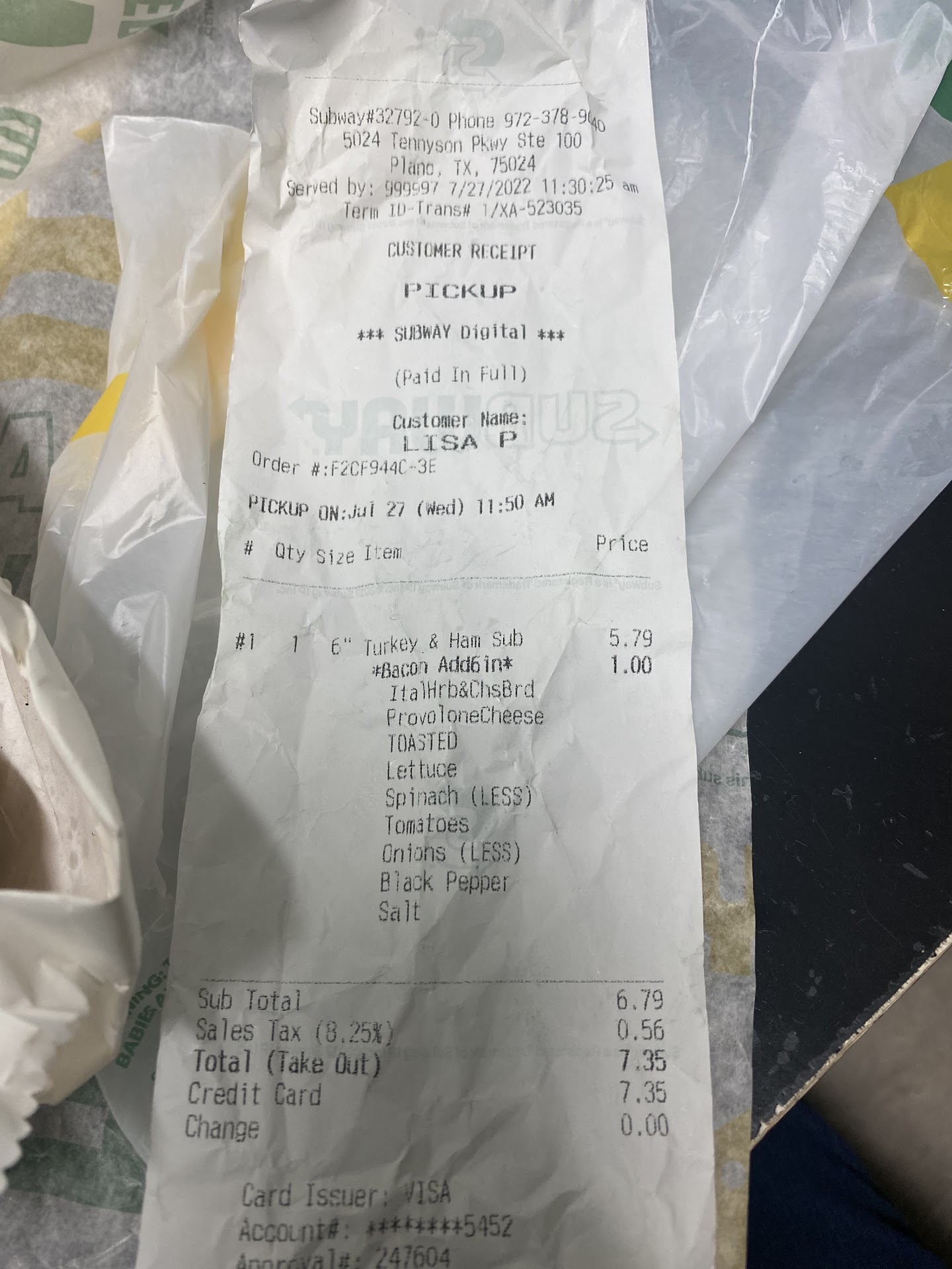 Read moreI've been coming here for a while since I work right in the area but the quality of the sandwiches have gone significantly worse from when I first started. I love eating subway but every time I come to this location now it makes me wonder what I even like about it. I usually order online so I just grab and go, this time my sandwich when I received it, I was almost convinced just bread based on the thickness until I opened it at the office. calling it just bread isn't far off from what I received. I ordered extra pickles and tomato, and got 4 of each for the whole foot long, so I'm guessing if you order normal amount you get like 1 piece on each half. Needless to say, if I ever want subway, I will remember this experience. Sad that Mcdonald's can produce a higher quality sandwich for a third of the cost as this Subway. Thank you for coming to...
